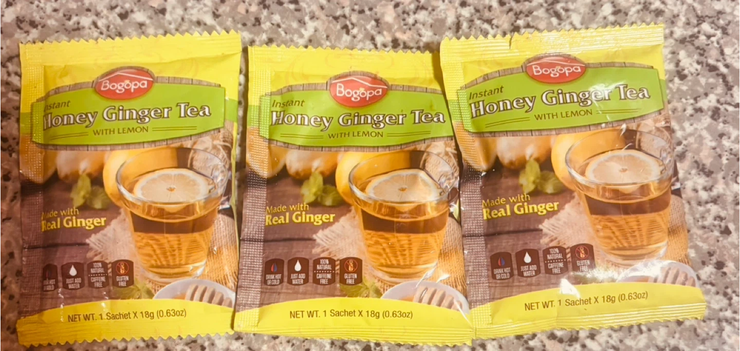 Three sachets of Bogopa instant Honey Ginger Tea with Lemon. Made with real ginger. Each sachet is 18g (0.63oz). Just add water. Drink hot or cold. Gluten-free and caffeine-free.