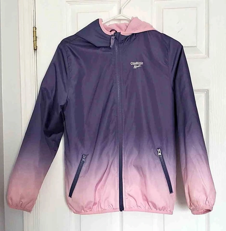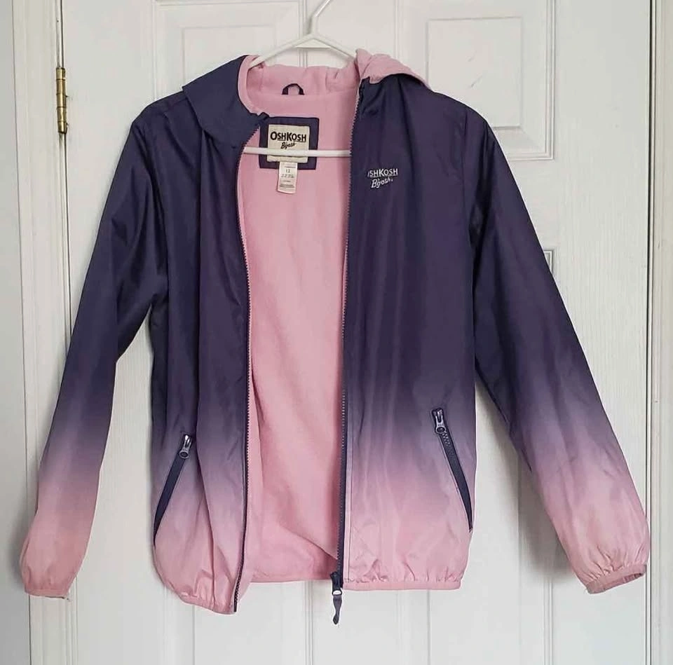 Girls Oshkosh spring rain coat jacket. Hooded and fleece lined with zipper pockets. Size 12. Cash only. If listing is up, it's available.