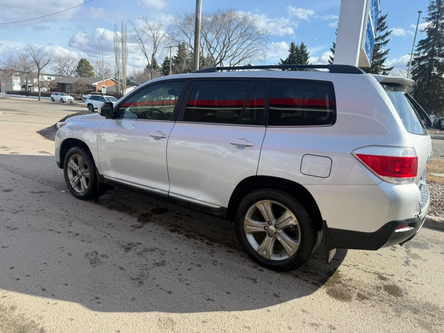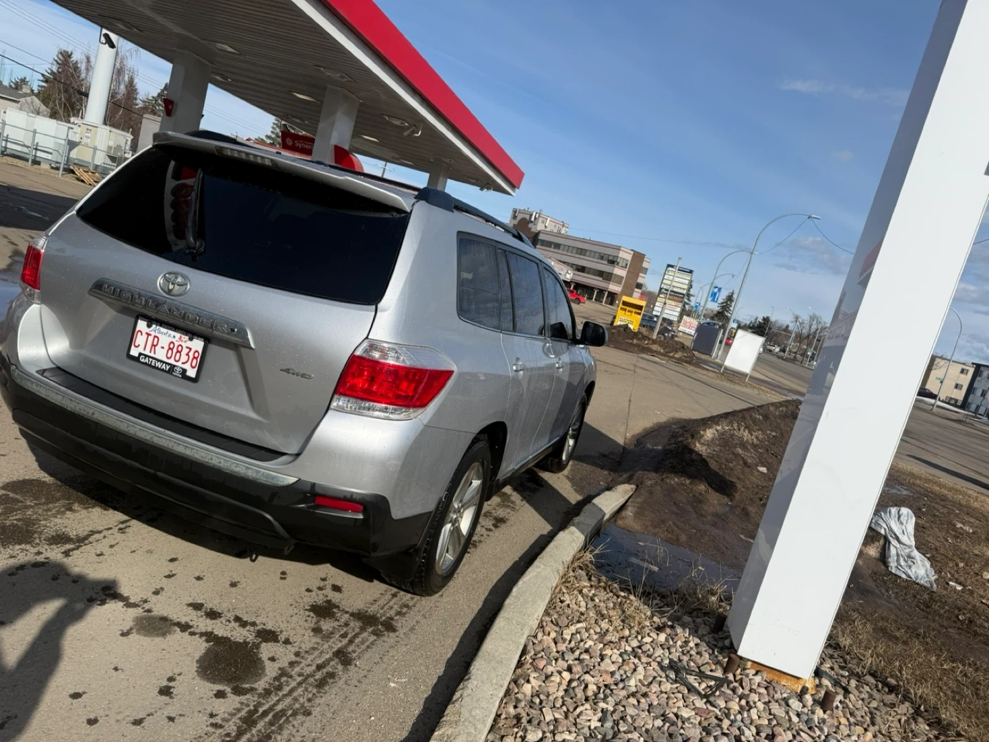 Silver Toyota Highlander SUV. It's a four-door vehicle with tinted windows and a roof rack. Excellent for family trips or daily commuting.