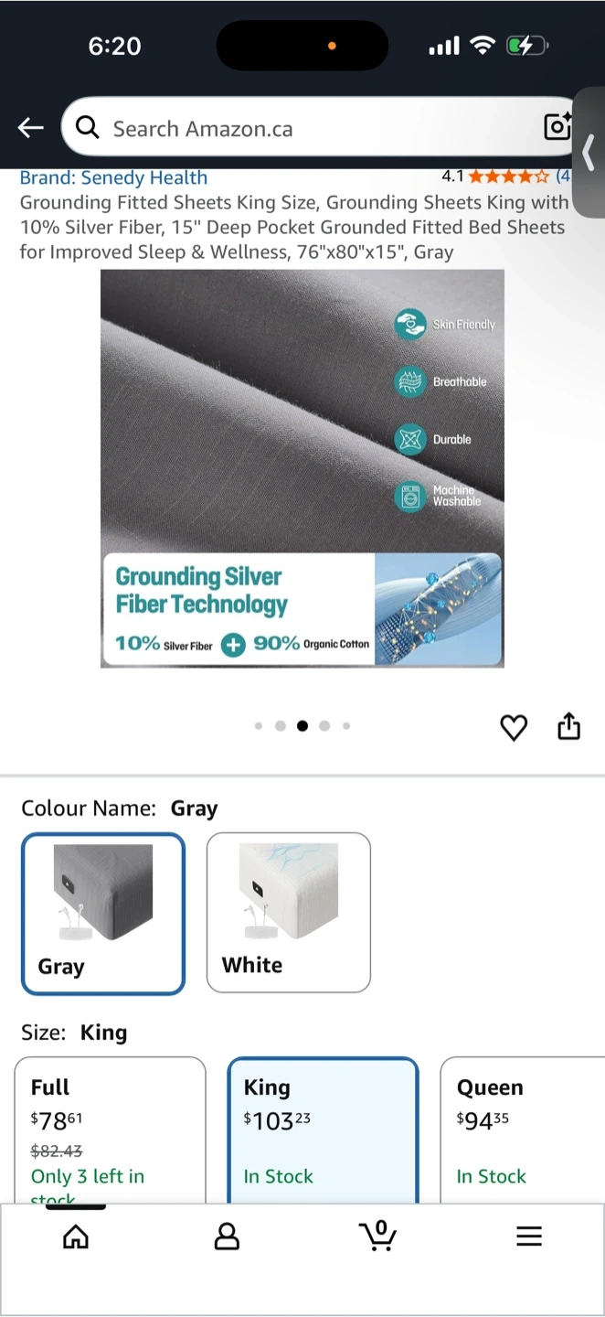 This grounding fitted sheet is made of 100% organic cotton with silver fiber technology. It's a King size sheet, measuring 76"x80"x15". It's breathable, durable, and machine washable. Great for promoting better sleep and wellness!