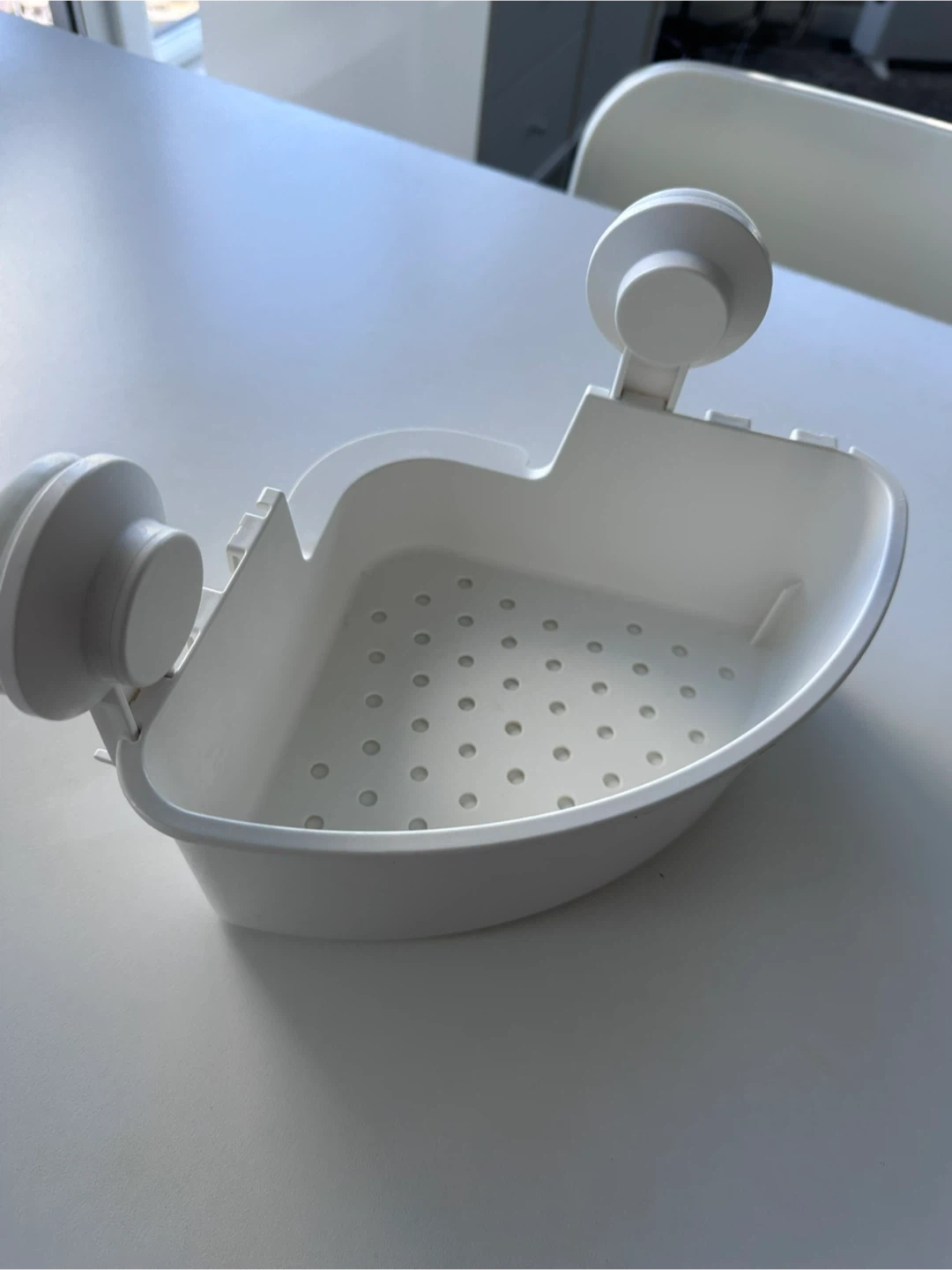 This white plastic shower caddy is designed to hang in your shower. It features small drain holes in the bottom. It comes with two suction cups for attachment.