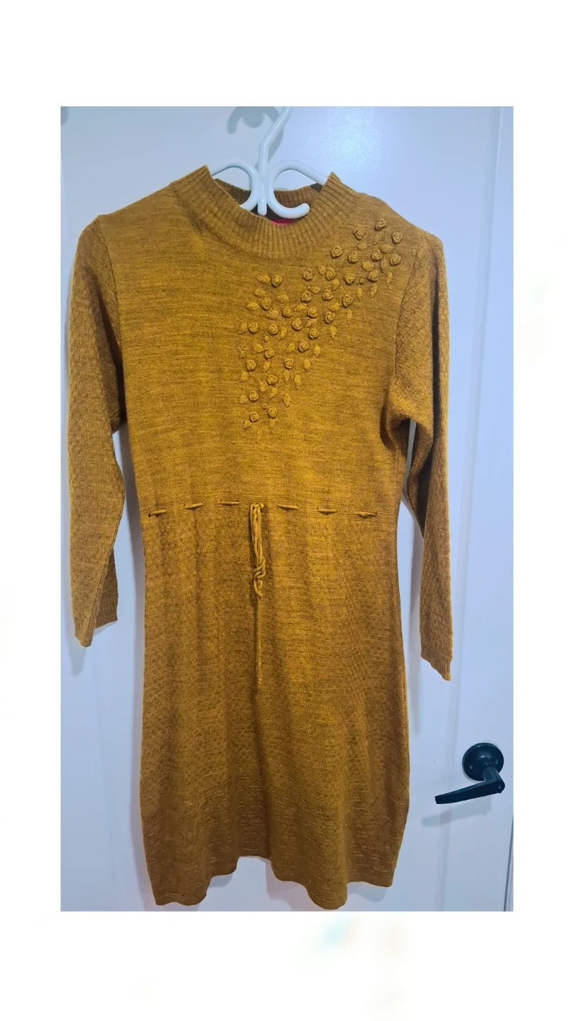 This mustard yellow sweater dress features a cozy knit and a decorative floral detail on the shoulder. It has a cinched waist with a drawstring for a flattering silhouette. The textured sleeves add a touch of interest.