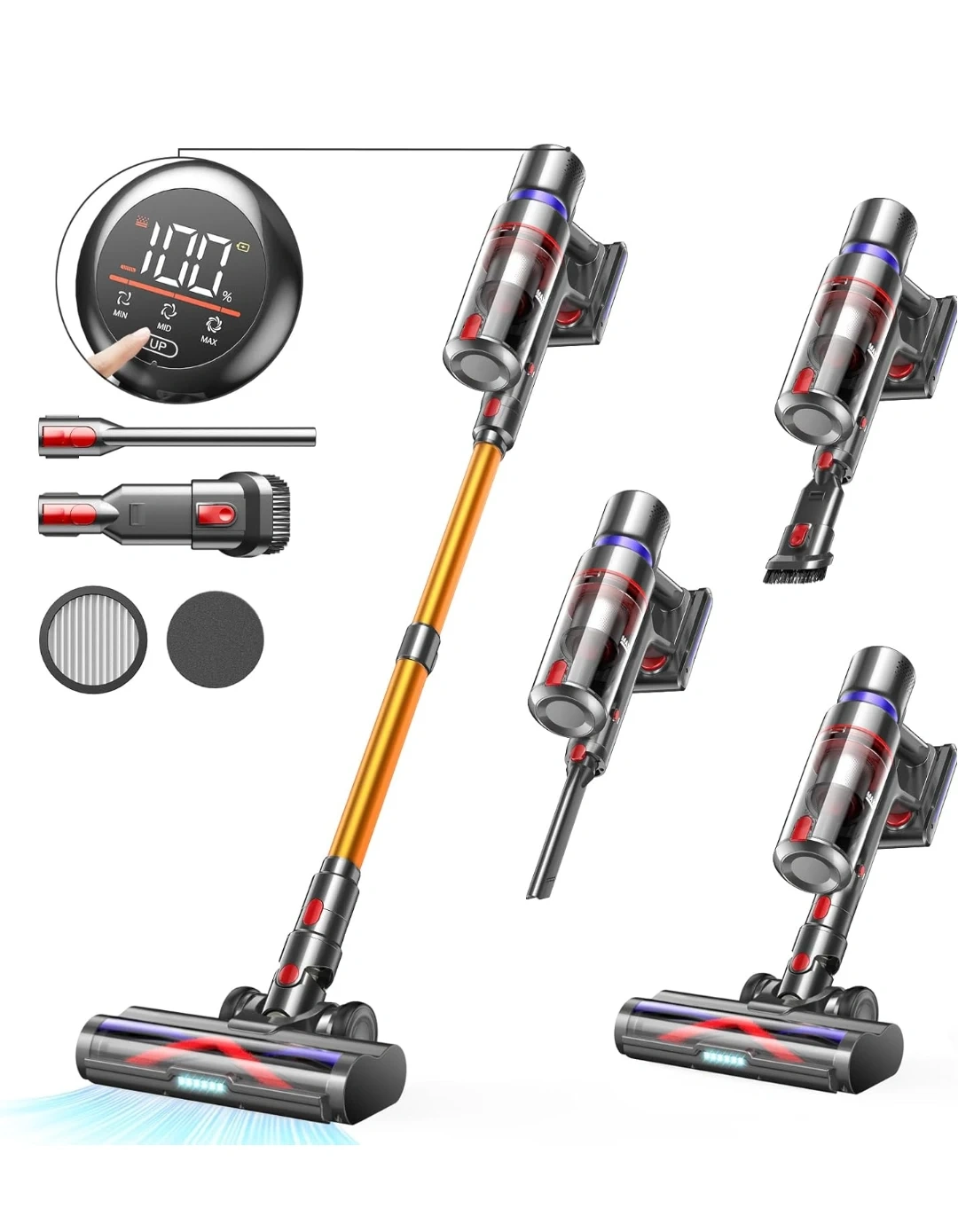 This cordless vacuum cleaner features a digital display showing 100% charge. It comes with multiple attachments, including a crevice tool and brush head. The vacuum also includes HEPA filters and a charging dock.