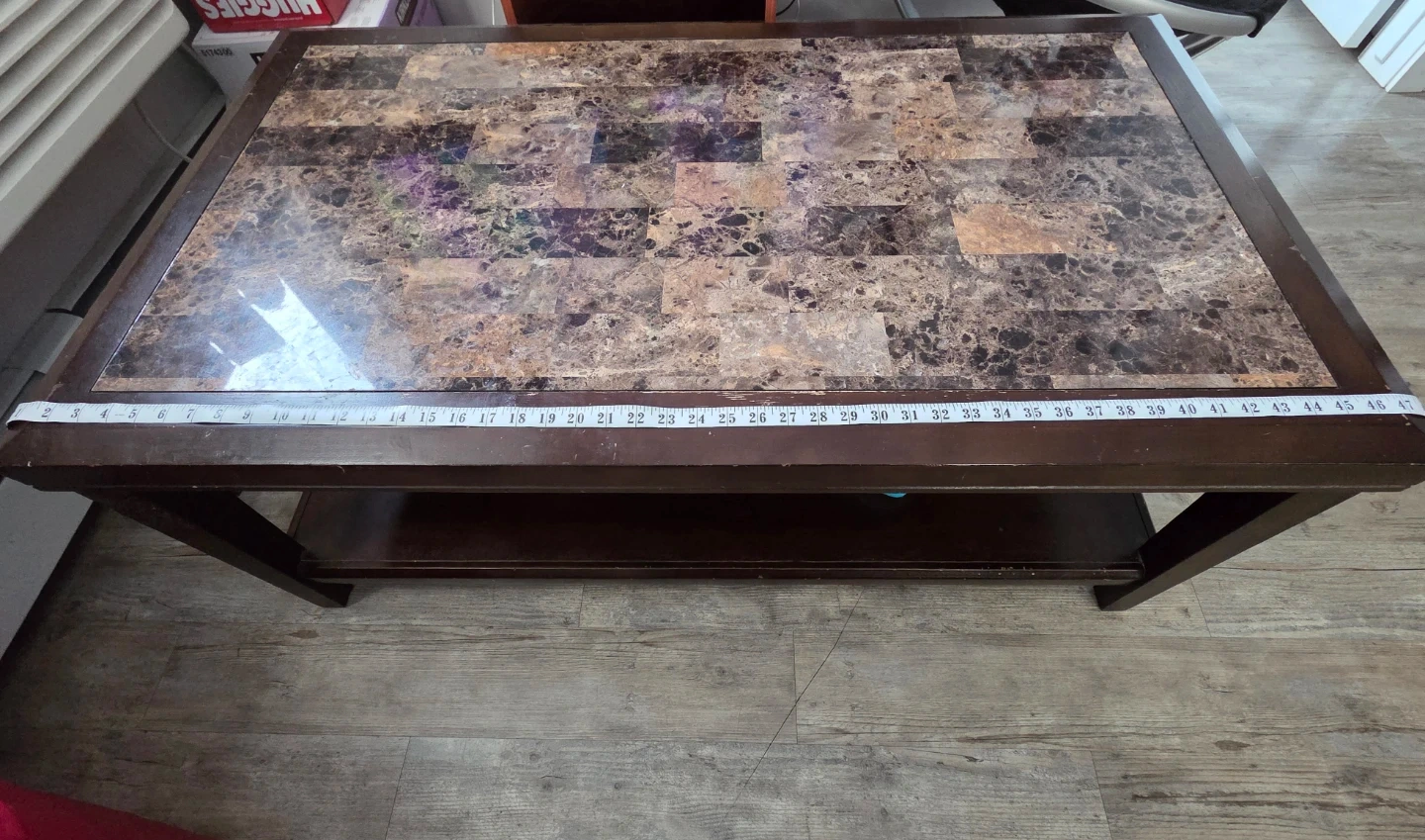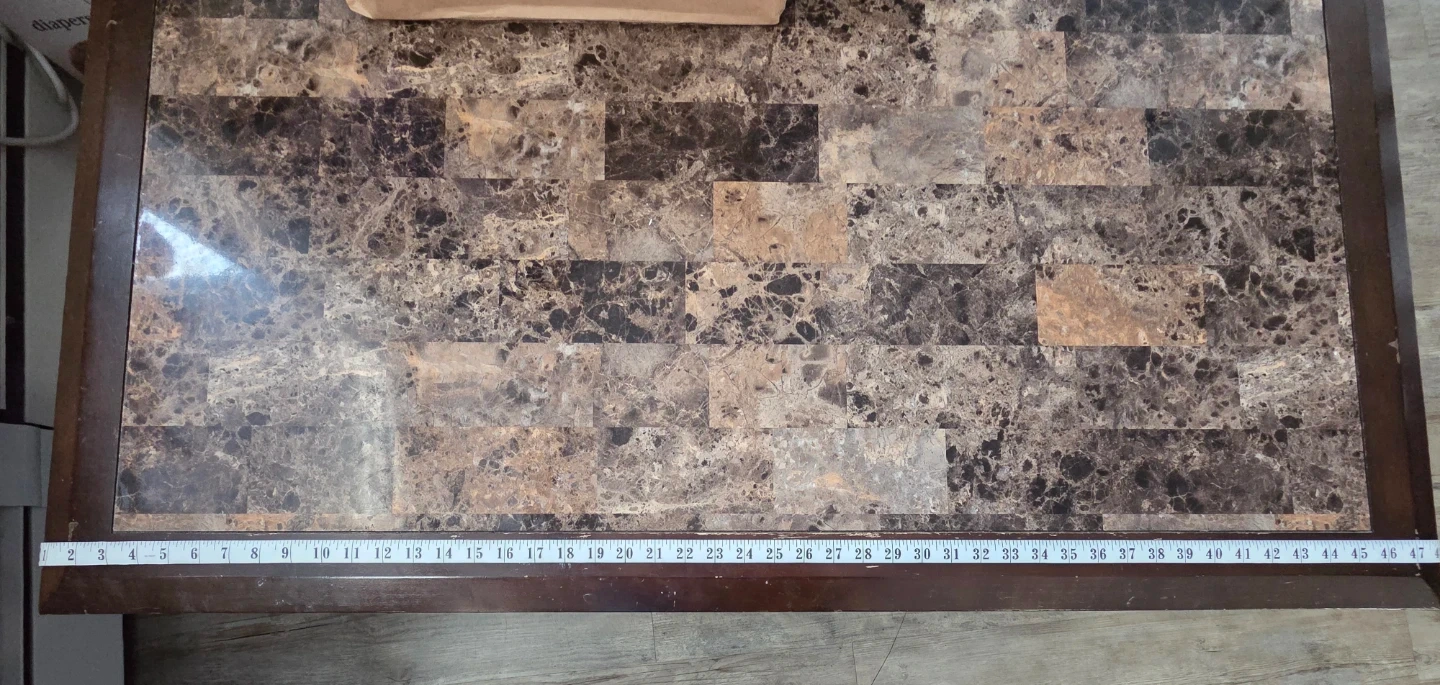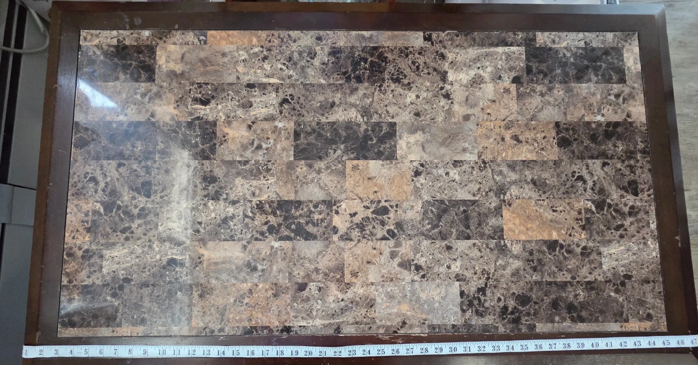 Beautiful and sturdy coffee table with a marble-style tiled top and dark wood frame. Very solid and maintained. Perfect for a living room or family room.