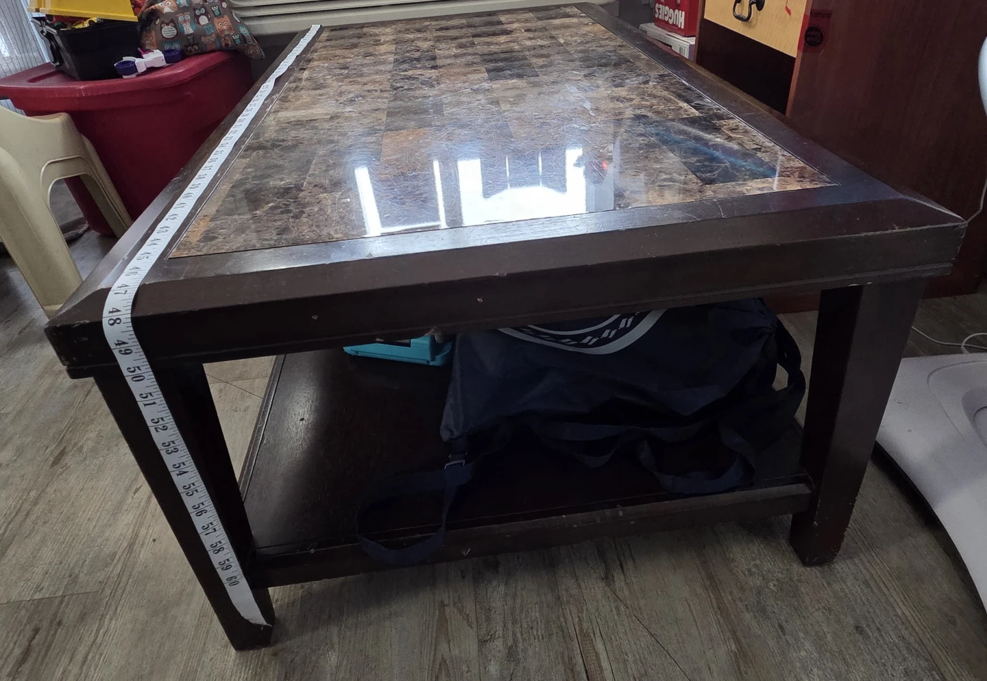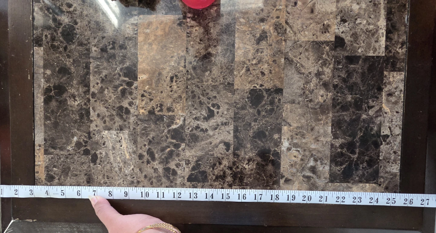 Beautiful and sturdy coffee table with a marble-style tiled top and dark wood frame. Very solid and maintained. Perfect for a living room or family room.