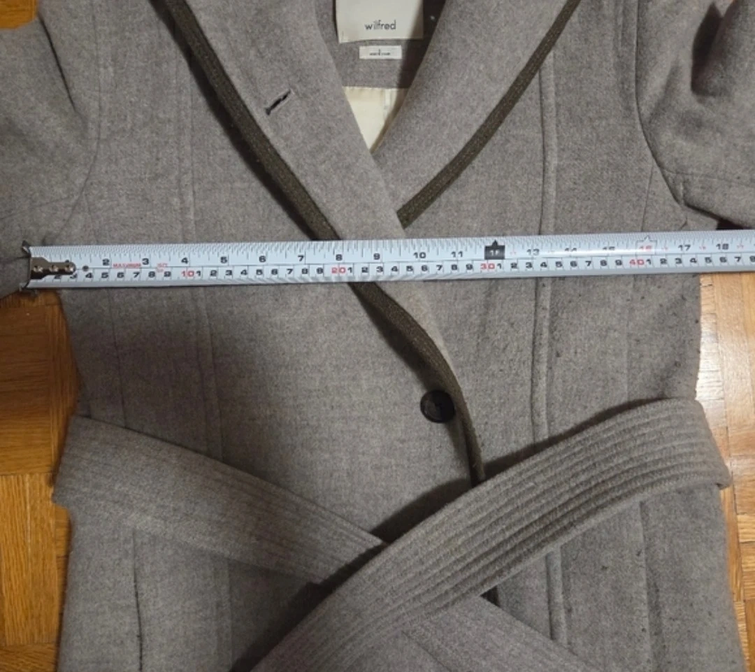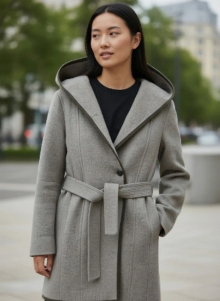 A stylish women's coat by Wilfred, featuring a grey Italian wool and cashmere blend fabric with a belted waist and button closure. Black trim around the coat adds a touch of class. The coat is designed for a modern look with a hood and a tailored fit. In great used condition. Some mild overall wear to the wool but still in really great condition.