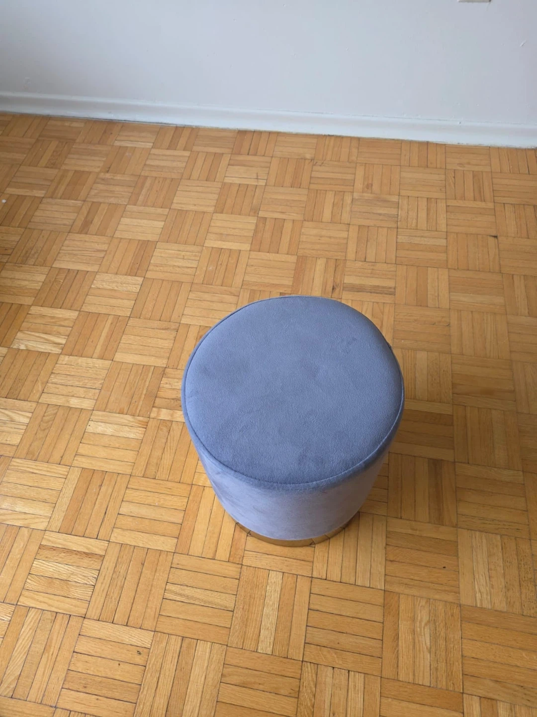 This round ottoman is upholstered in a soft grey velvet fabric. It features a stylish gold-tone base. It's perfect for adding extra seating or as a footrest. Only used for 4 months.