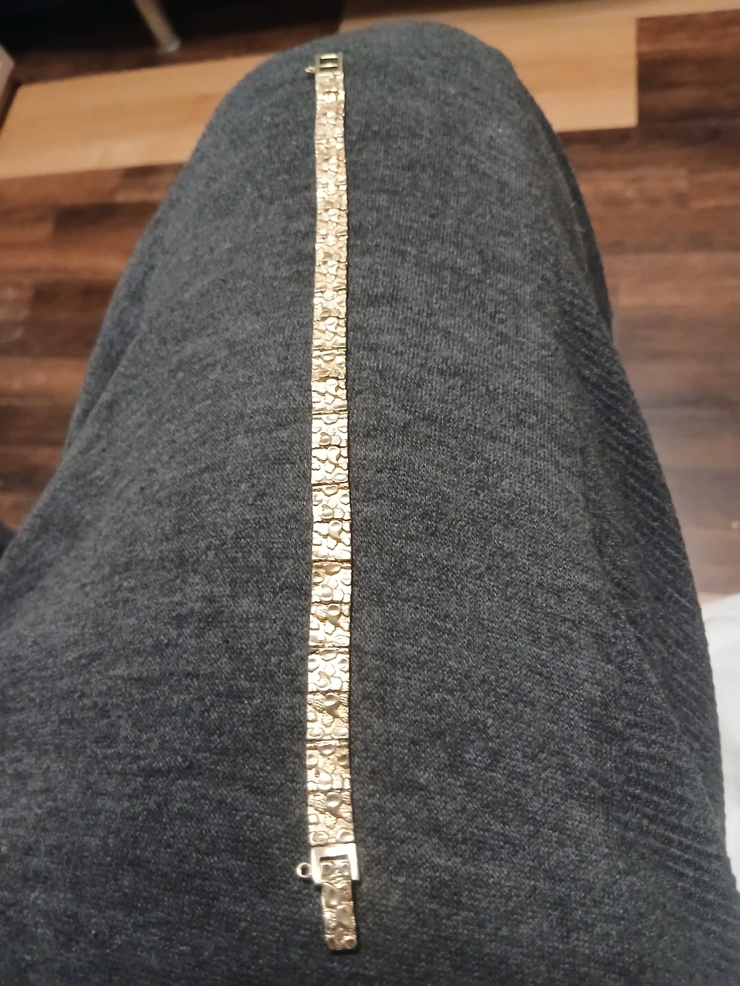 This textured bracelet has a link design and a gold-tone finish. It weighs 14.3 grams. This would be a nice addition to a jewellery collection. Cell # 604*349*6392