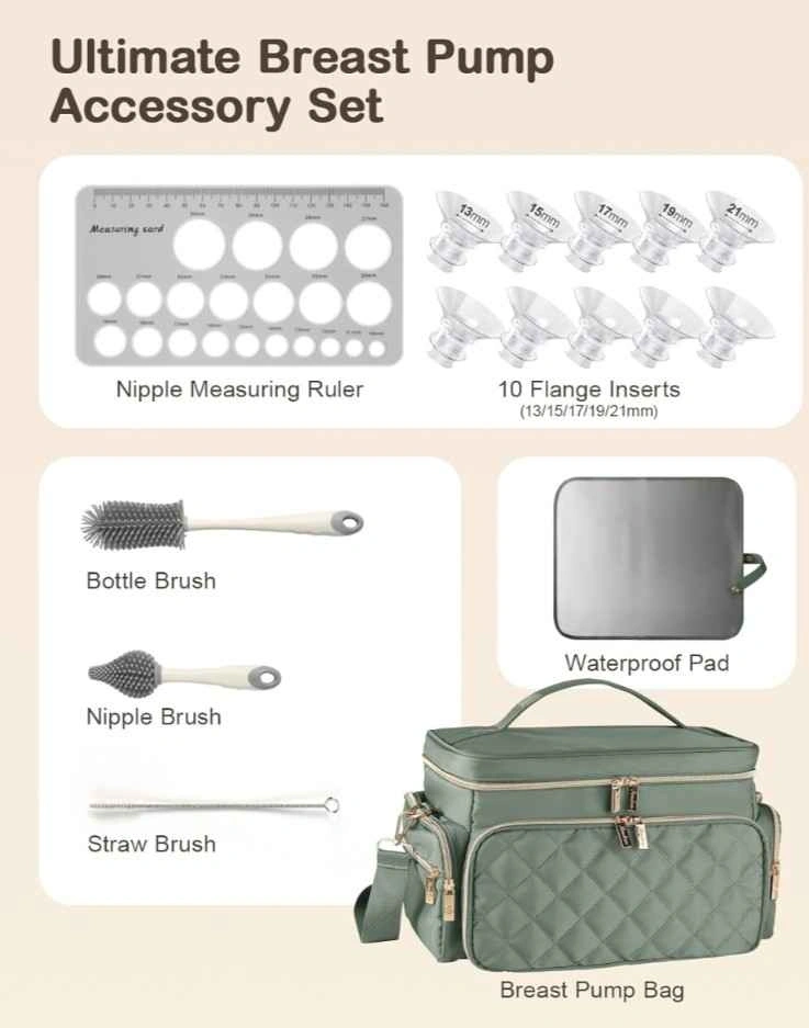Stylish & functional bag that fits Spectra S1/S2 perfectly. Includes 10 flange inserts (sizes: 13mm, 15mm, 17mm, 19mm, 21mm) and a bottle brush set for easy cleaning. Multiple compartments for bottles and accessories.