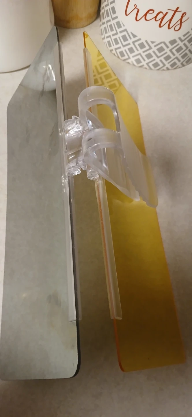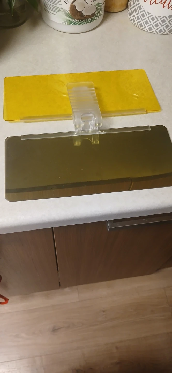 This set includes two car sun visor extenders. One is a tinted visor, and the other is a mirrored visor. They clip onto your existing car visor for added sun protection.
