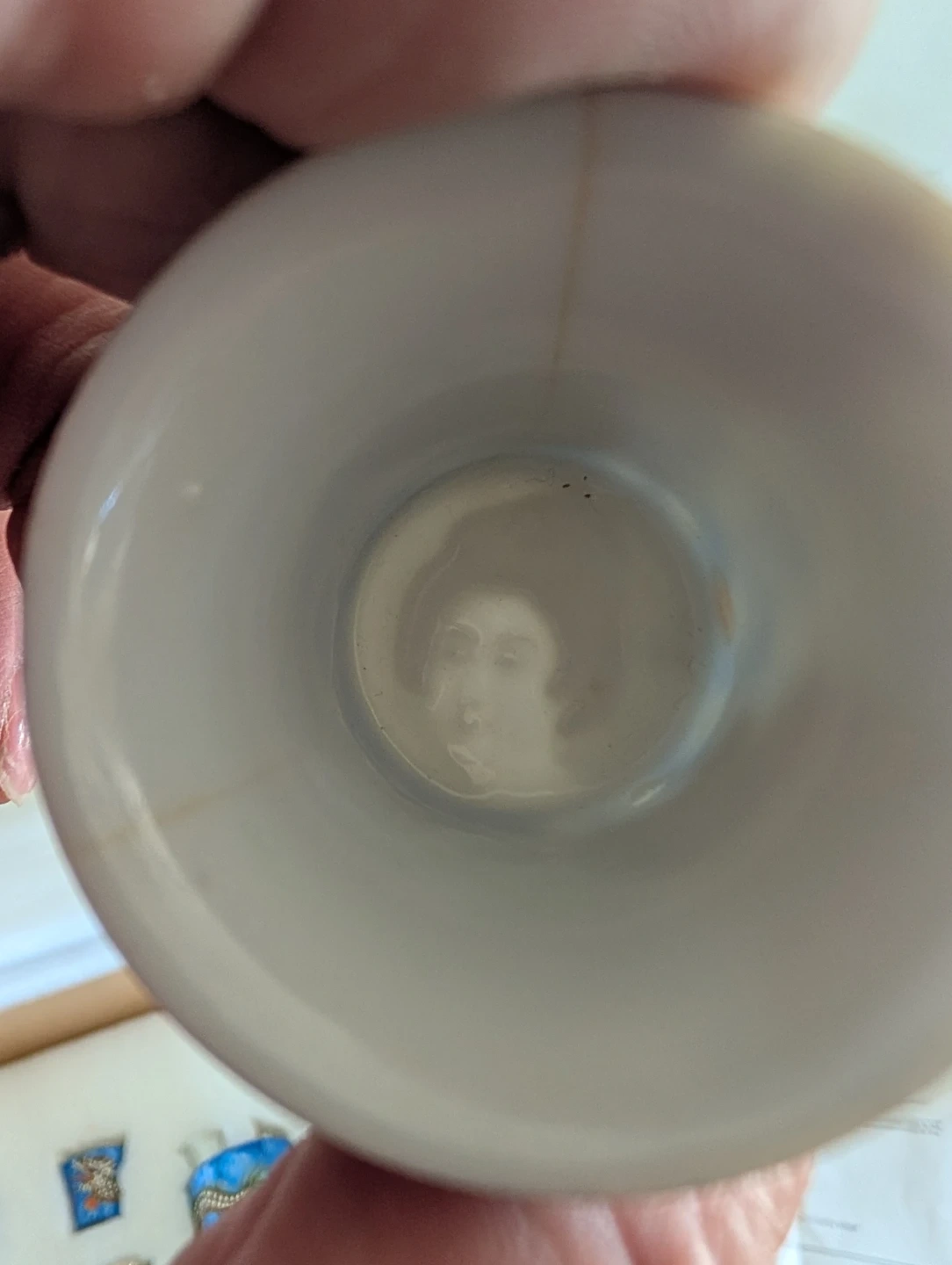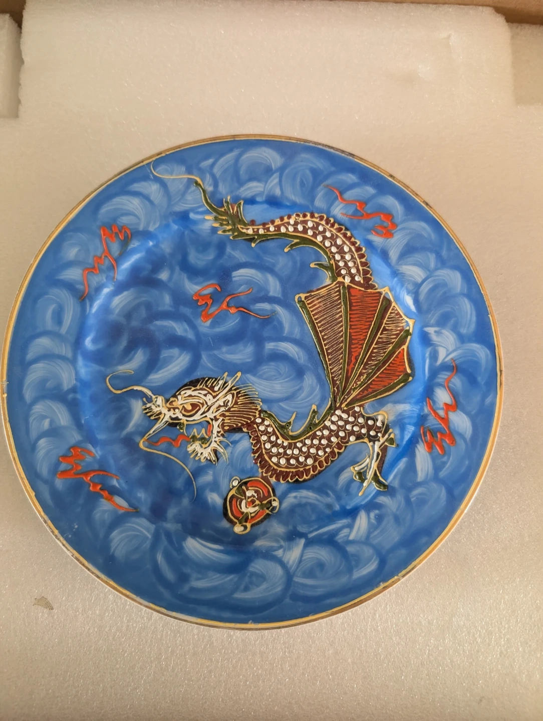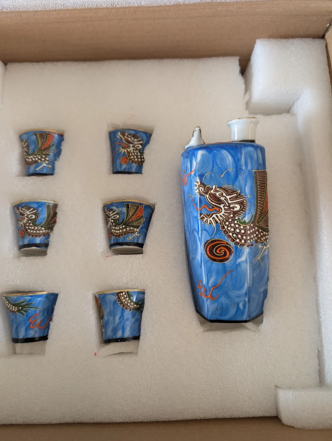 Selling a decorative samurai saki set featuring a blue glaze with a dragon motif. Includes one carafe and six small cups. This set is quite striking!circle 1930 smuggled from France during WW2 from my mother,serving plate was made in 1960 as original one broke