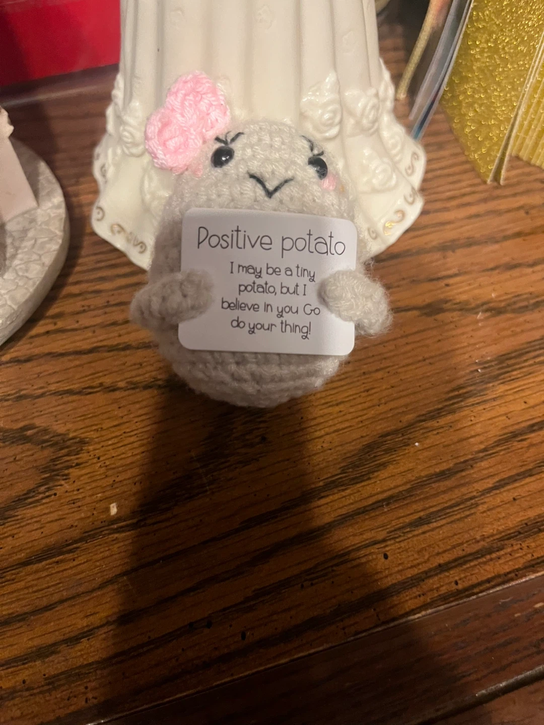 This is a small, crocheted potato figure. It's holding a sign that says "Positive potato I may be a tiny potato, but I believe in you Go do your thing!". It has a cute pink bow on its head.