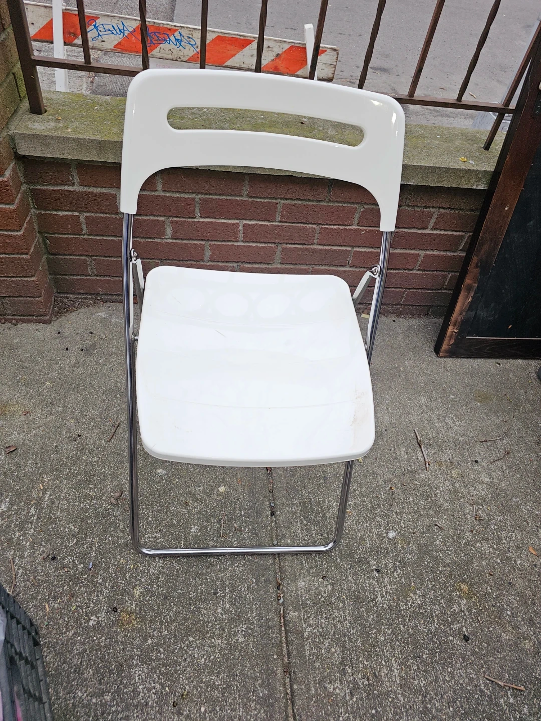 This is a white IKEA NISSE folding chair. This chair folds for easy storage.