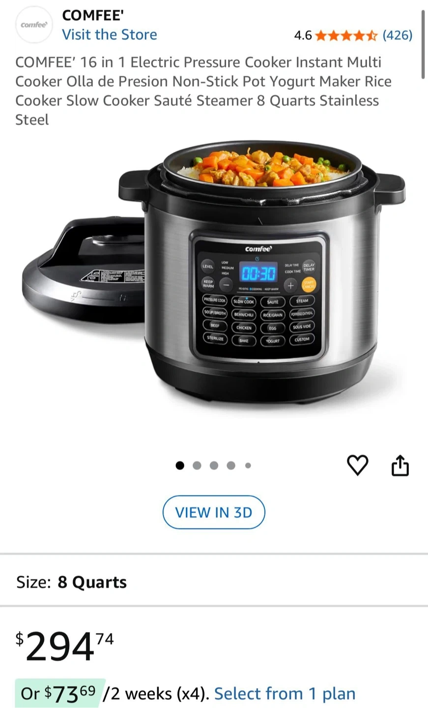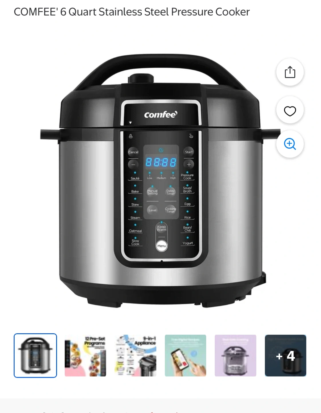Selling a COMFEE' 6 Quart Electric Pressure Cooker. It's a multi-functional programmable slow cooker, rice cooker, steamer, sauté pan, egg cooker, warmer and more! This pressure cooker has 12 pre-set programs and a healthy non-stick inner pot. It also features an easy-to-use read panel and electronic customized recipes. Comes with the box!