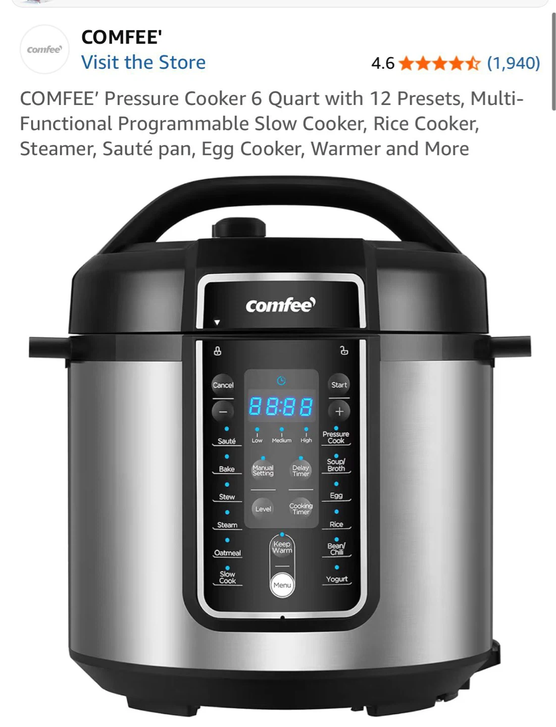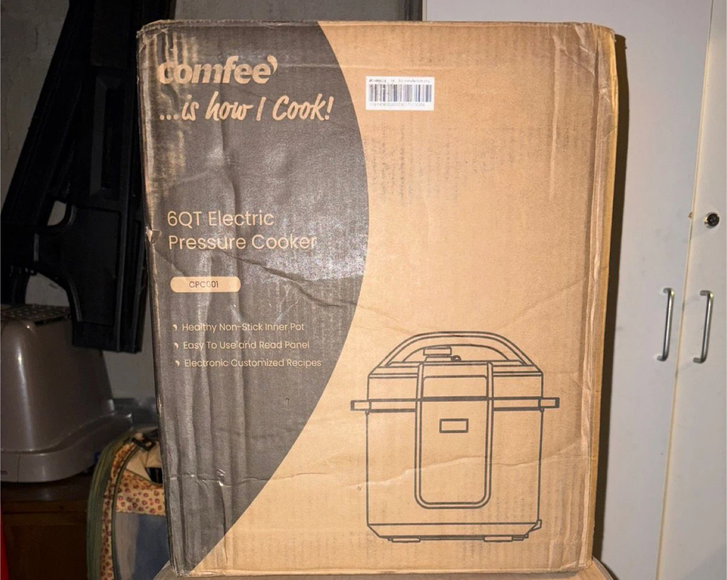 Selling a COMFEE' 6 Quart Electric Pressure Cooker. It's a multi-functional programmable slow cooker, rice cooker, steamer, sauté pan, egg cooker, warmer and more! This pressure cooker has 12 pre-set programs and a healthy non-stick inner pot. It also features an easy-to-use read panel and electronic customized recipes. Comes with the box!