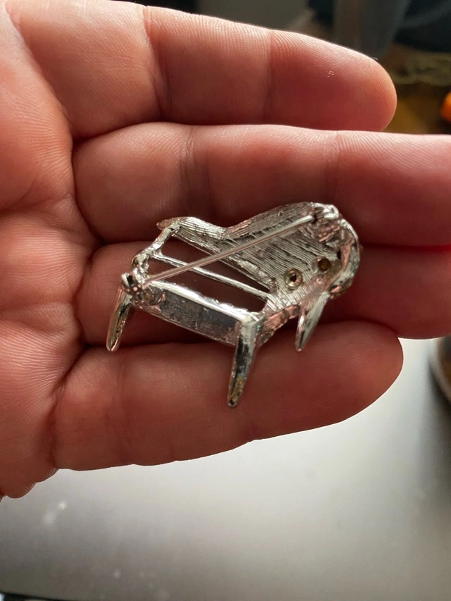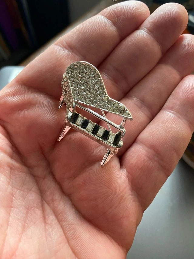 Add a touch of musical charm to your outfit with this used vintage (1980s) piano brooch featuring sparkling rhinestones, perfect for music lovers and collectors alike. This charming piece is in good condition, ready to pin on your favourite jacket or scarf. Even though it's small, it adds a note of elegance to any look! If the ad is still up, yes, it’s still available, ready to find its next home.