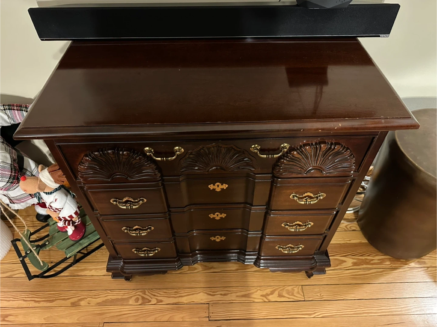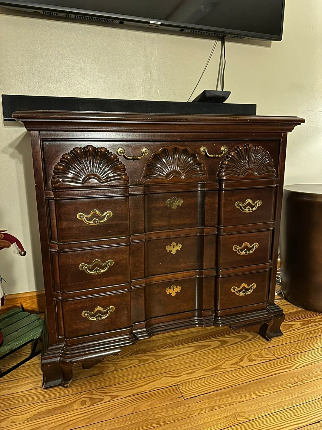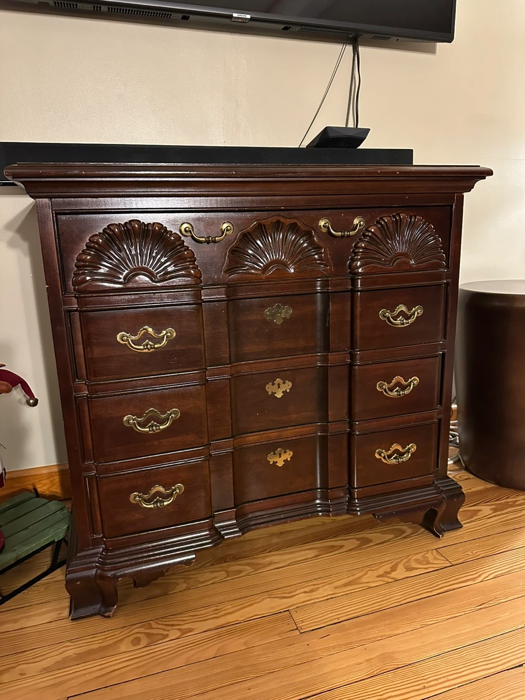 Dark wood dresser with unique gold hardware and shell detailing. It has nine drawers, great for storage. The dresser is in good condition and ready for a new home!