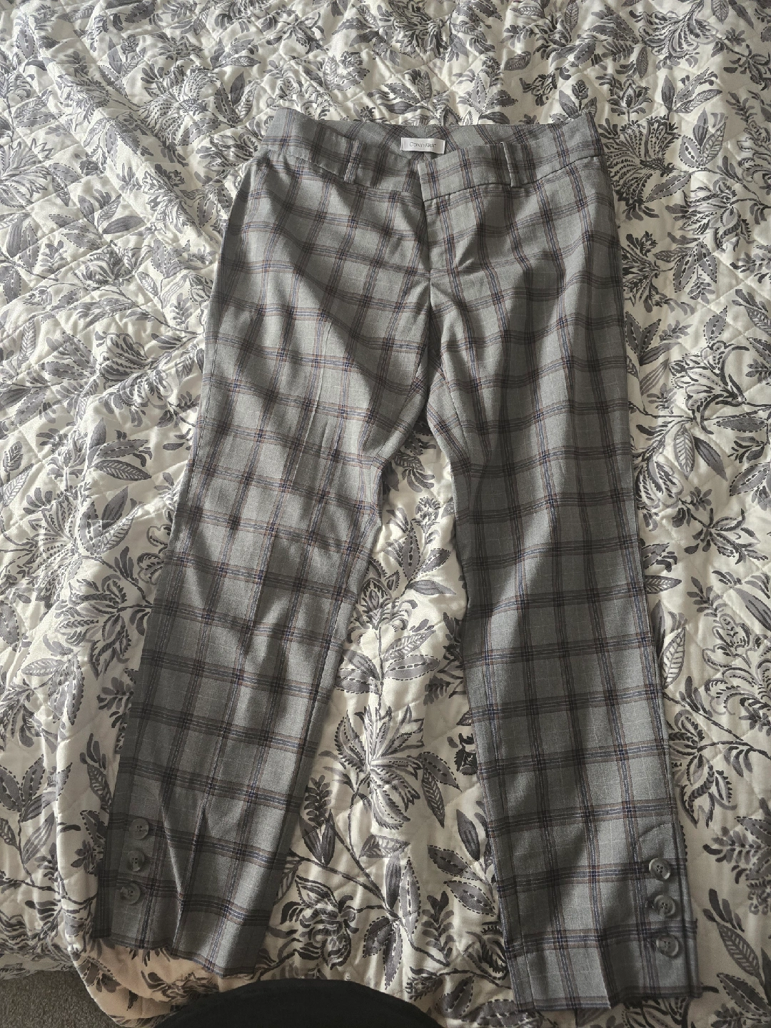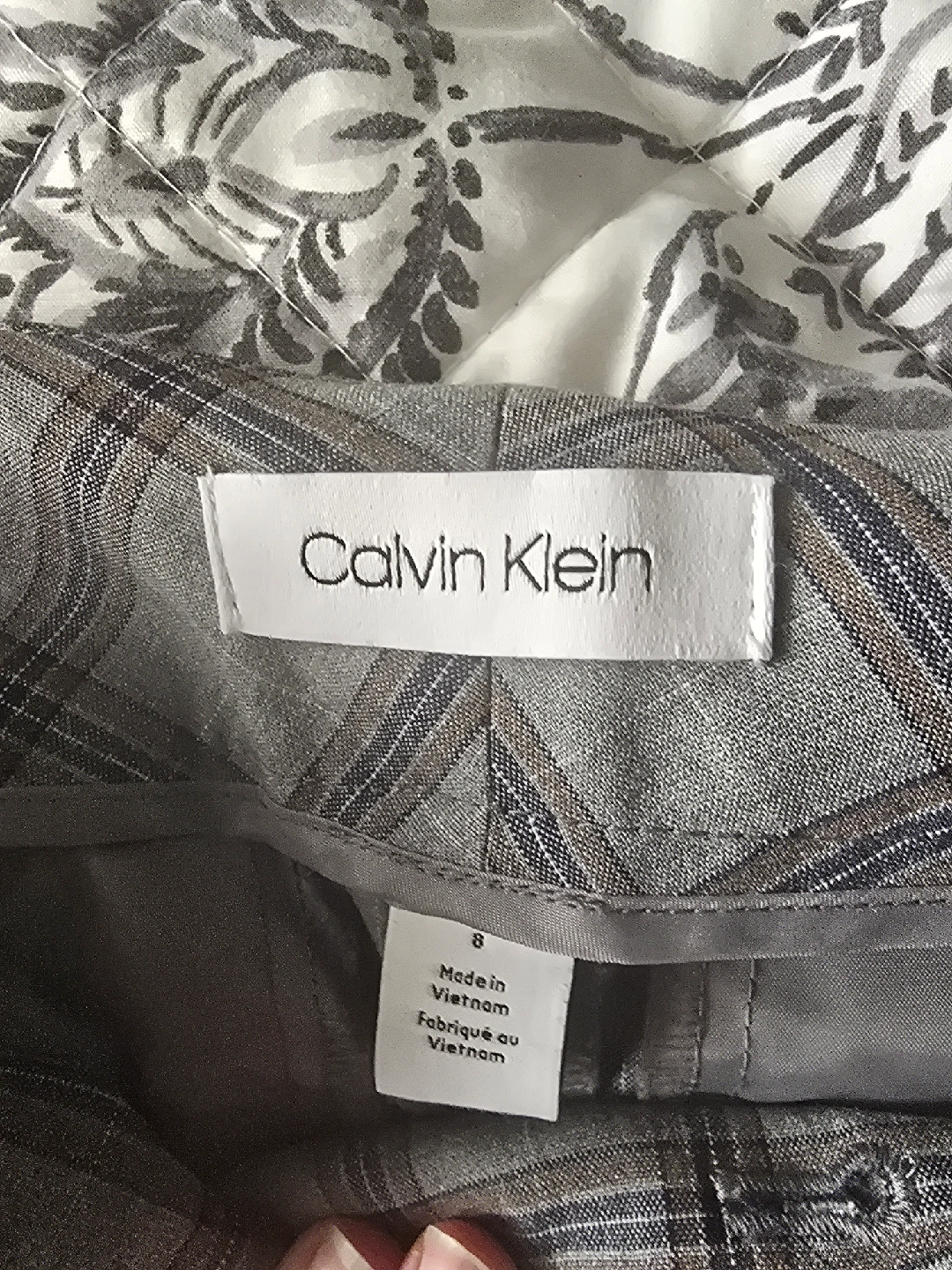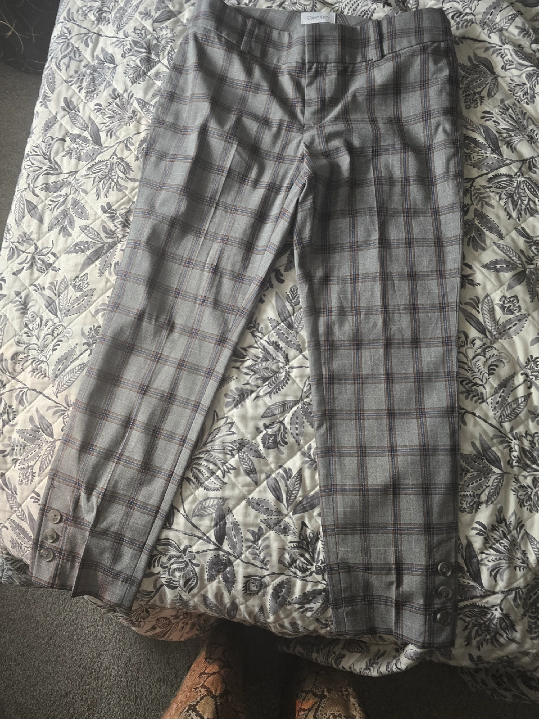 Selling a pair of Calvin Klein plaid trousers in size 8. They're in great condition and have a stylish plaid pattern. Perfect for adding a touch of sophistication to your wardrobe!