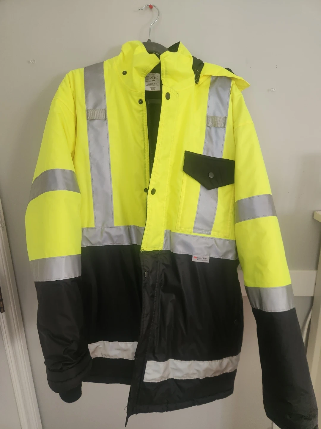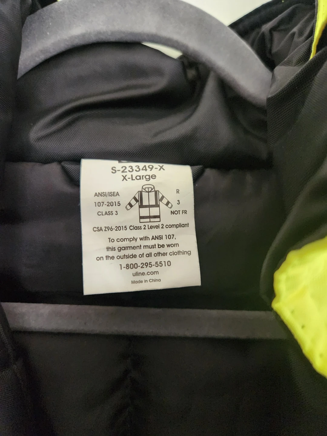 This Uline jacket is designed for high visibility and safety compliance. It meets ANSI/ISEA 107-2015 Class 3 and CSA Z96-2015 Class 2 Level 2 standards. The garment is designed to be worn over other clothing for maximum visibility. Made in China.