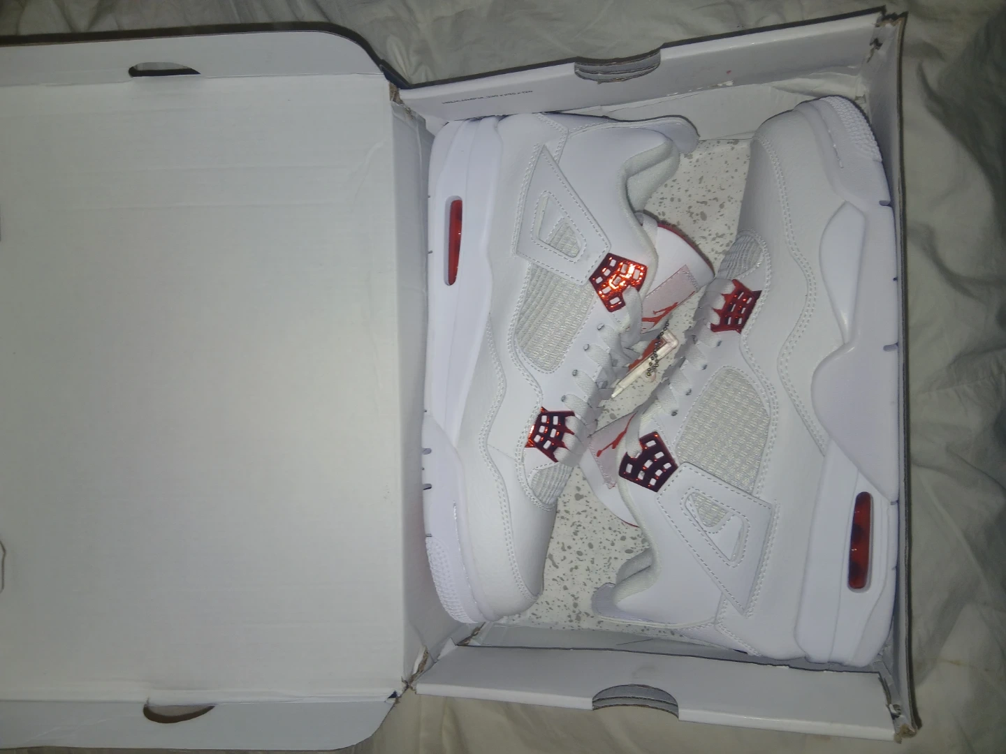 These are Air Jordan 4 sneakers in a white and red colourway. They come with their original box and a hang tag. These kicks are a classic design for any sneaker enthusiast! Cell # 604*349*6392