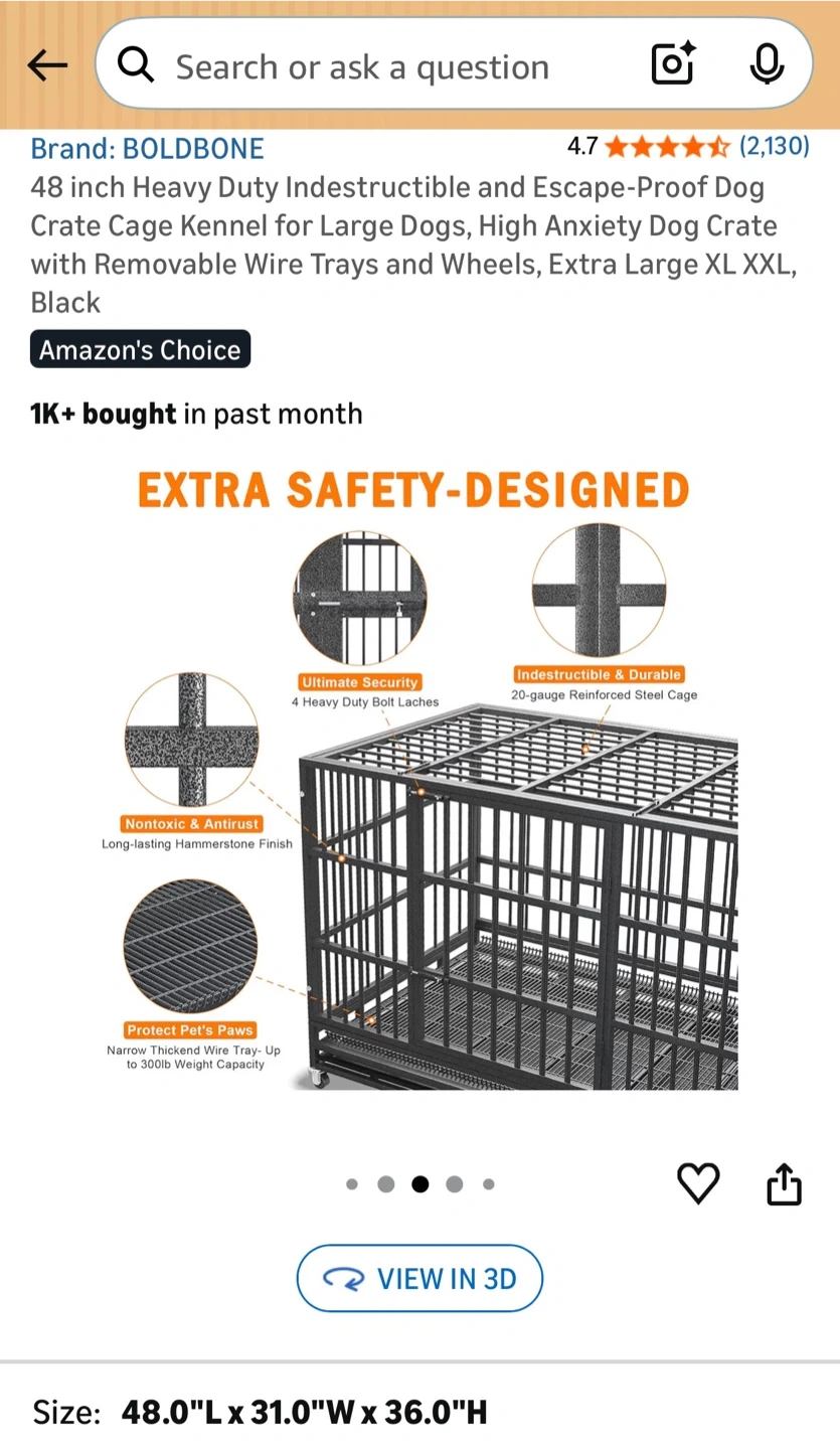 This is a BOLD BONE 48 inch heavy duty dog crate made from 20-gauge reinforced steel. It features an indestructible and durable design with a nontoxic, hammerstone finish. The crate has four heavy-duty bolt latches for ultimate security and includes removable wire trays and wheels. It's extra large with a maximum weight capacity of 300 lbs.