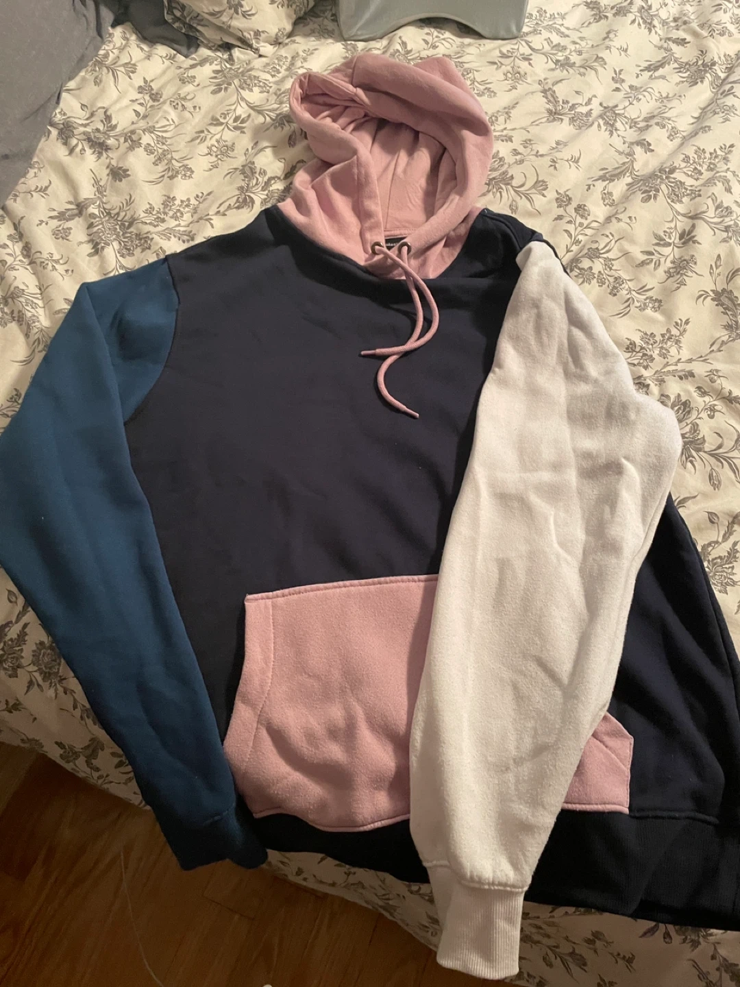 Cozy Bluenotes hoodie in a cool colour block design! This hoodie is size L/G and features a mix of navy, pink, blue, and white. Perfect for staying warm and stylish.