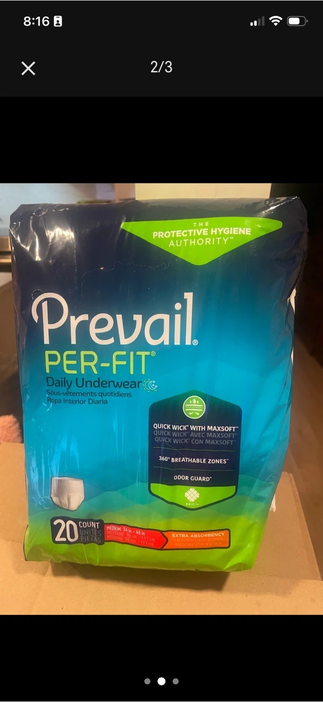 Prevail Per-Fit Daily Underwear in size medium. These have 360° breathable zones and odor guard protection. They come in a 20-count package and feature Quick Wick with MaxSoft technology.