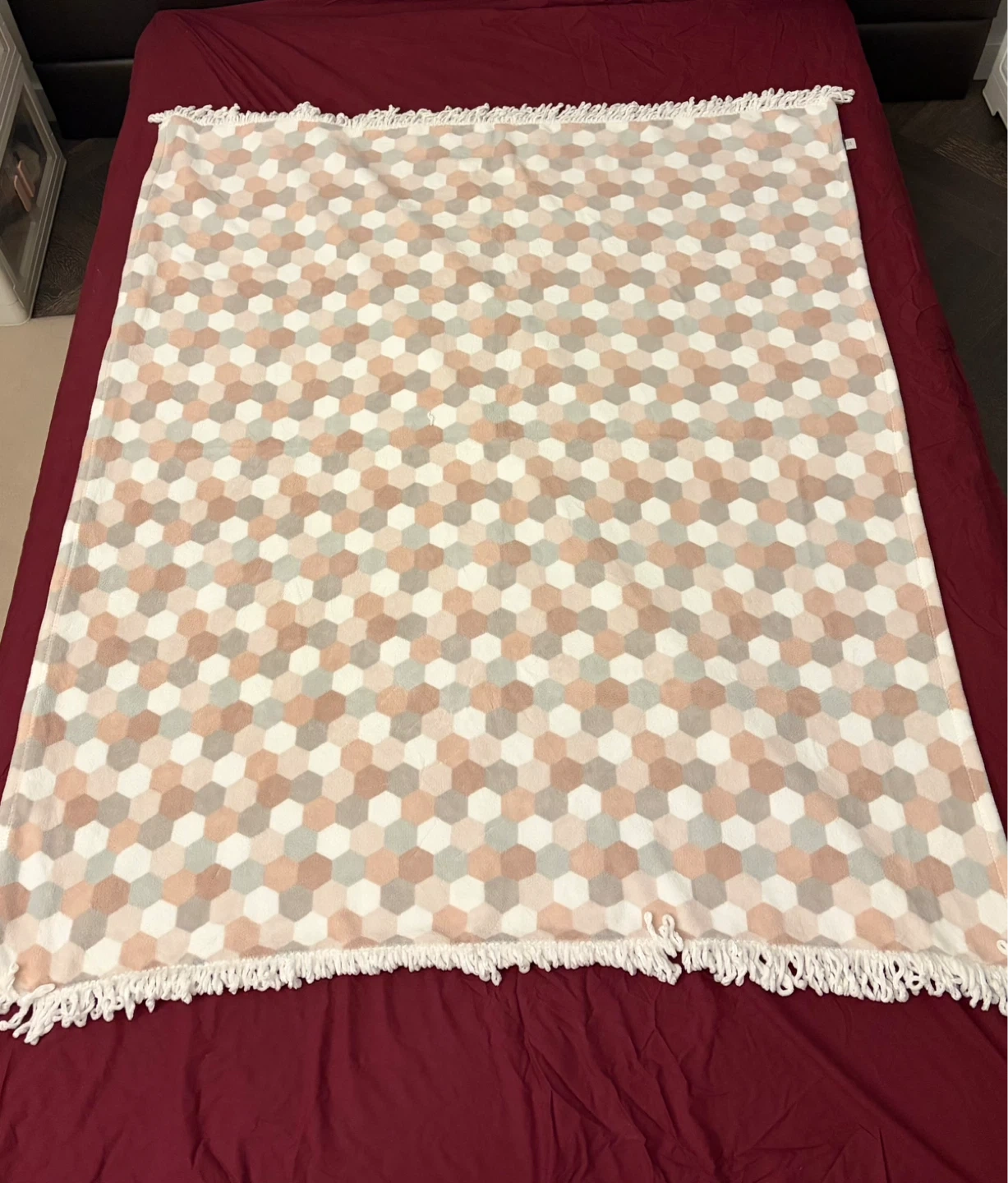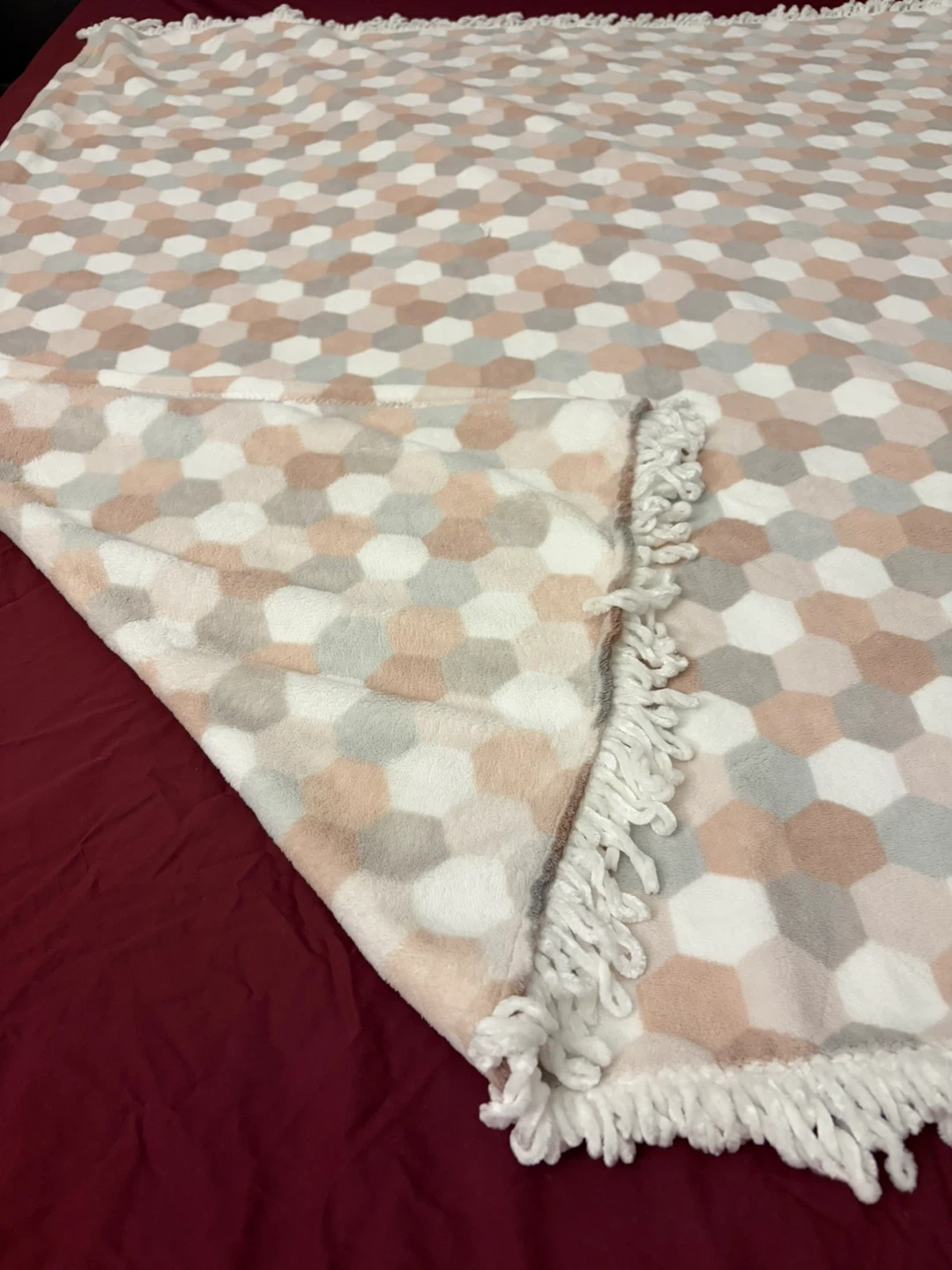 This super soft fuzzy throw blanket features a modern hexagon pattern in shades of pink, gray, and white. It's finished with a white fringe trim. It's perfect for adding a cozy touch to your couch or bed!