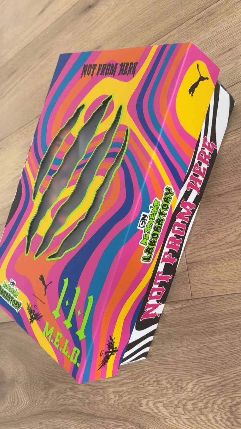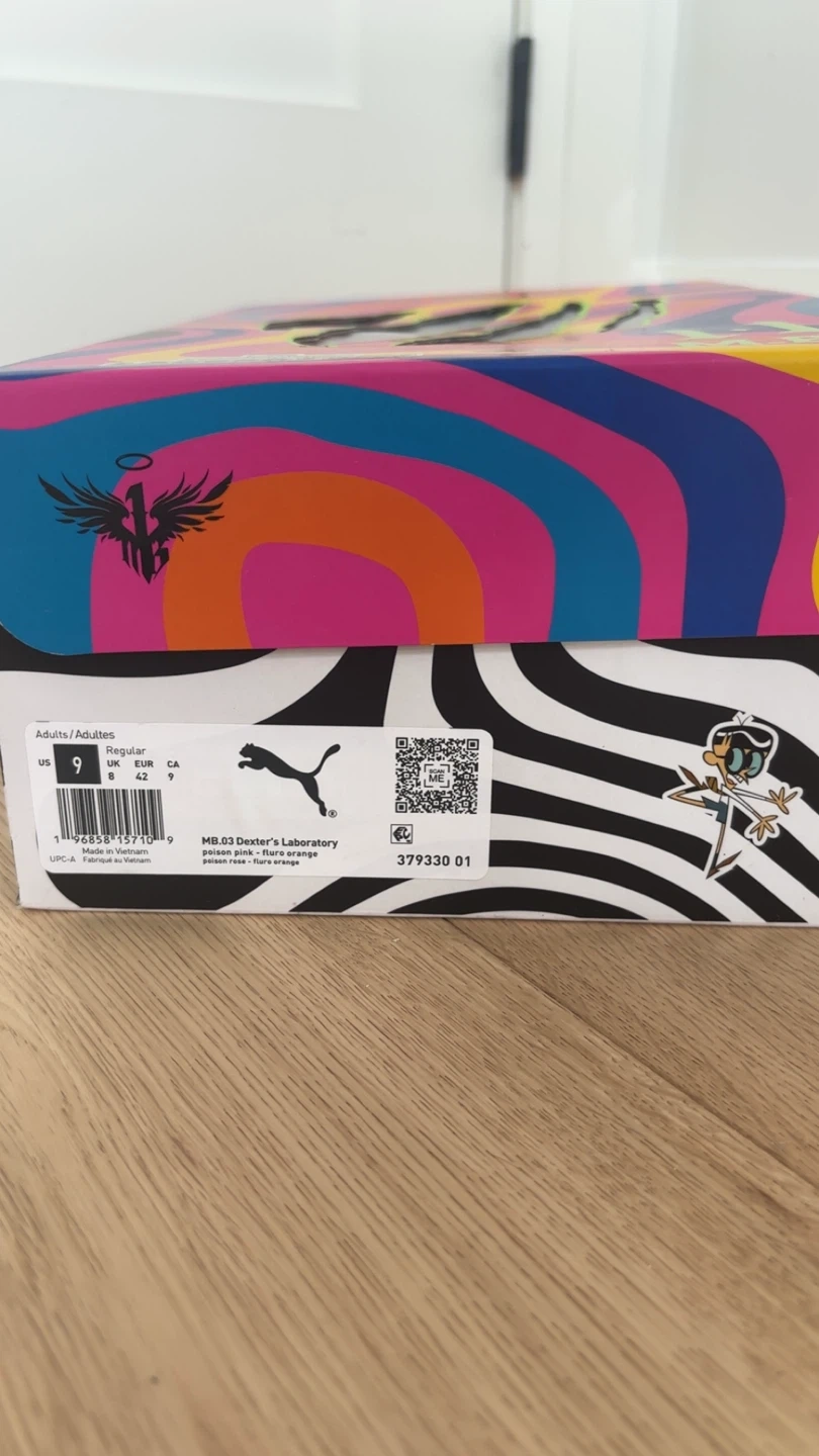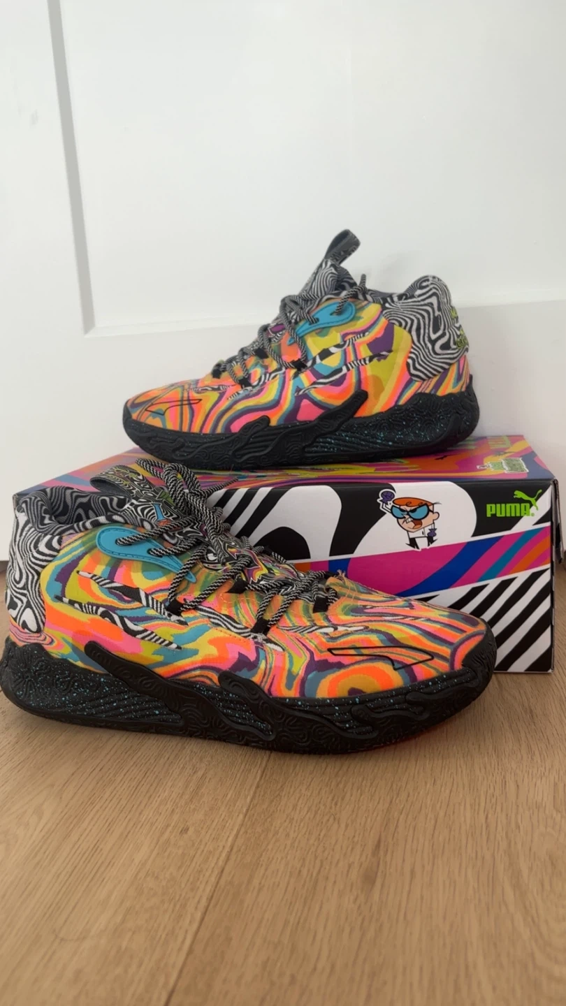 These Puma MB.03 basketball shoes are a collaboration with Dexter's Laboratory. They're a size 9 US for adults. The vibrant, multicoloured design is eye-catching! Never used.