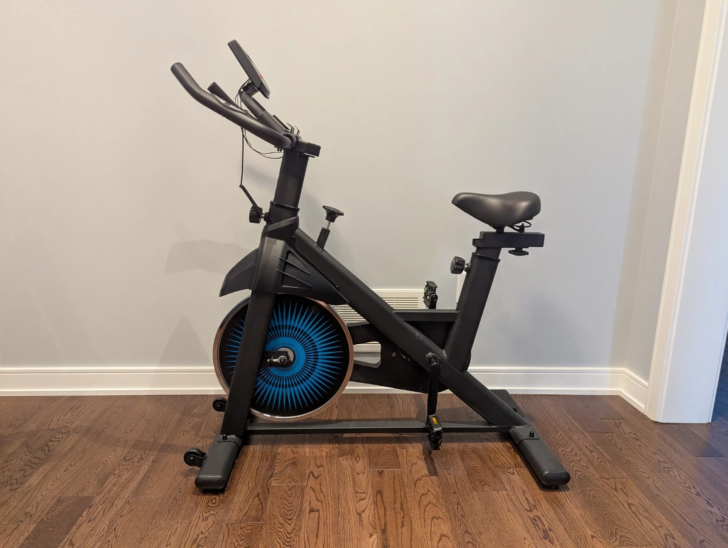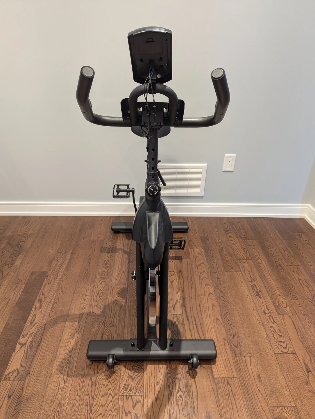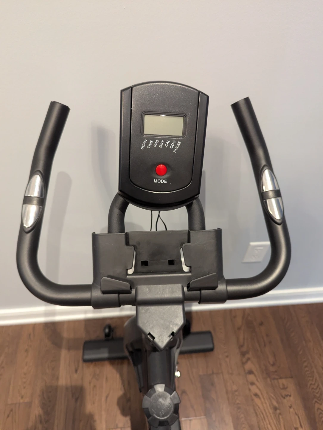 This black exercise bike is great for home workouts. It features a digital display that tracks time, speed, distance, calories, and pulse. Adjustments are easy with the twist knobs for resistance and seat height. It's built with a sturdy frame and wheels for easy movement. This bike is suitable for anyone looking to get in shape at home!