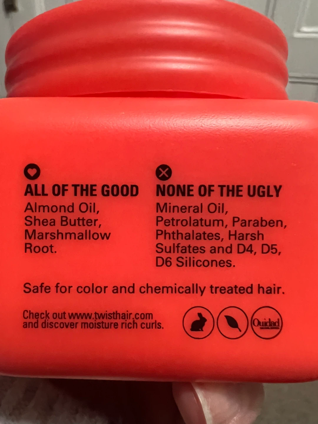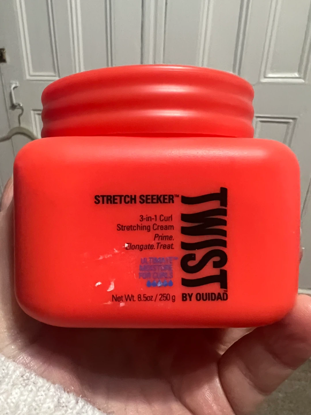 This is TWIST Stretch Seeker 3-in-1 Curl Stretching Cream by Ouidad . It's formulated with "ALL OF THE GOOD" ingredients like Almond Oil, Shea Butter, and Marshmallow Root. "NONE OF THE UGLY" ingredients like Mineral Oil, Petrolatum, Paraben, Phthalates, Harsh Sulfates, and silicones are included. This cream is safe for color and chemically treated hair.