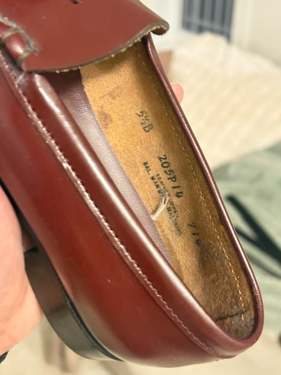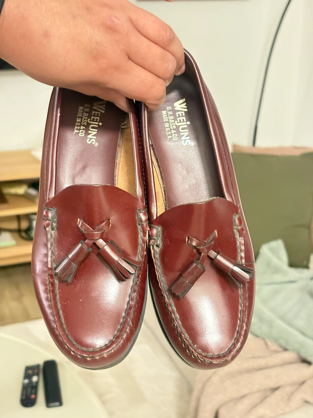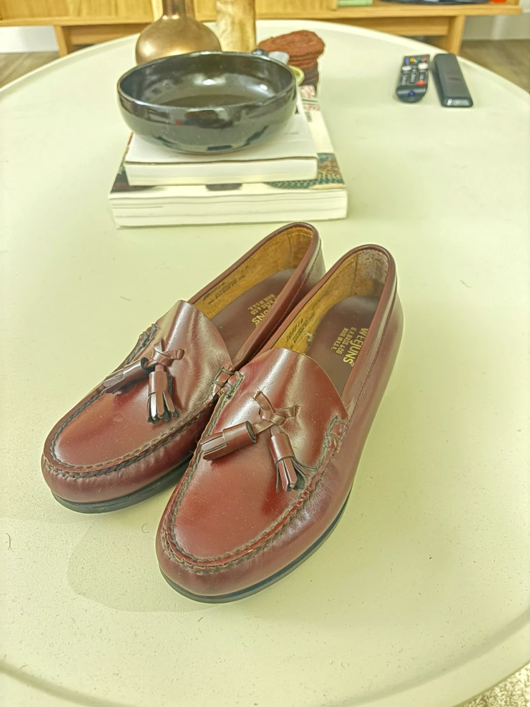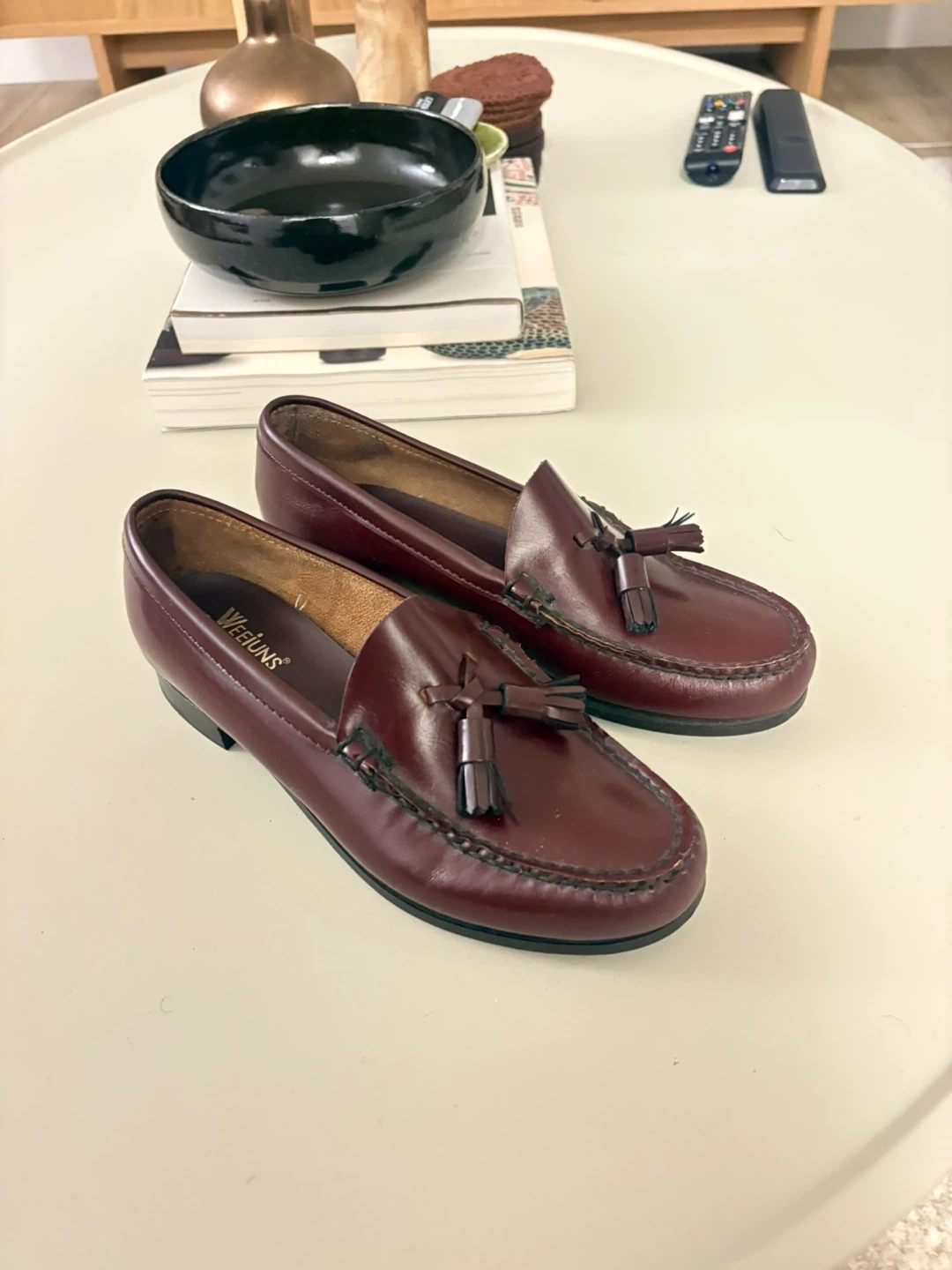 Classic burgundy leather loafers from Weejuns. Features a tassel detail on the vamp. Size is 5.5B. Leather upper and lining.