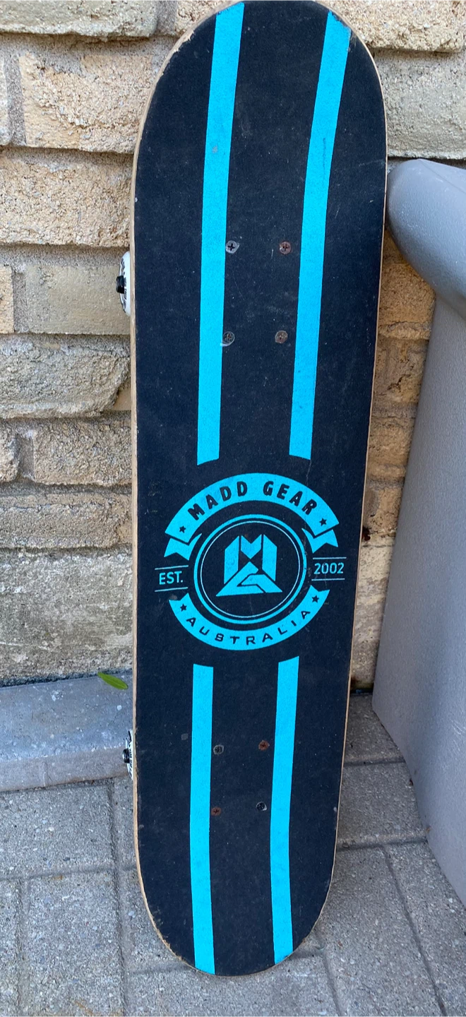 Here's a used Madd Gear skateboard looking for a new home! It's got some wear and tear, but it's still ready to roll. Perfect for anyone looking to practice their kickflips or just cruise around the neighbourhood.