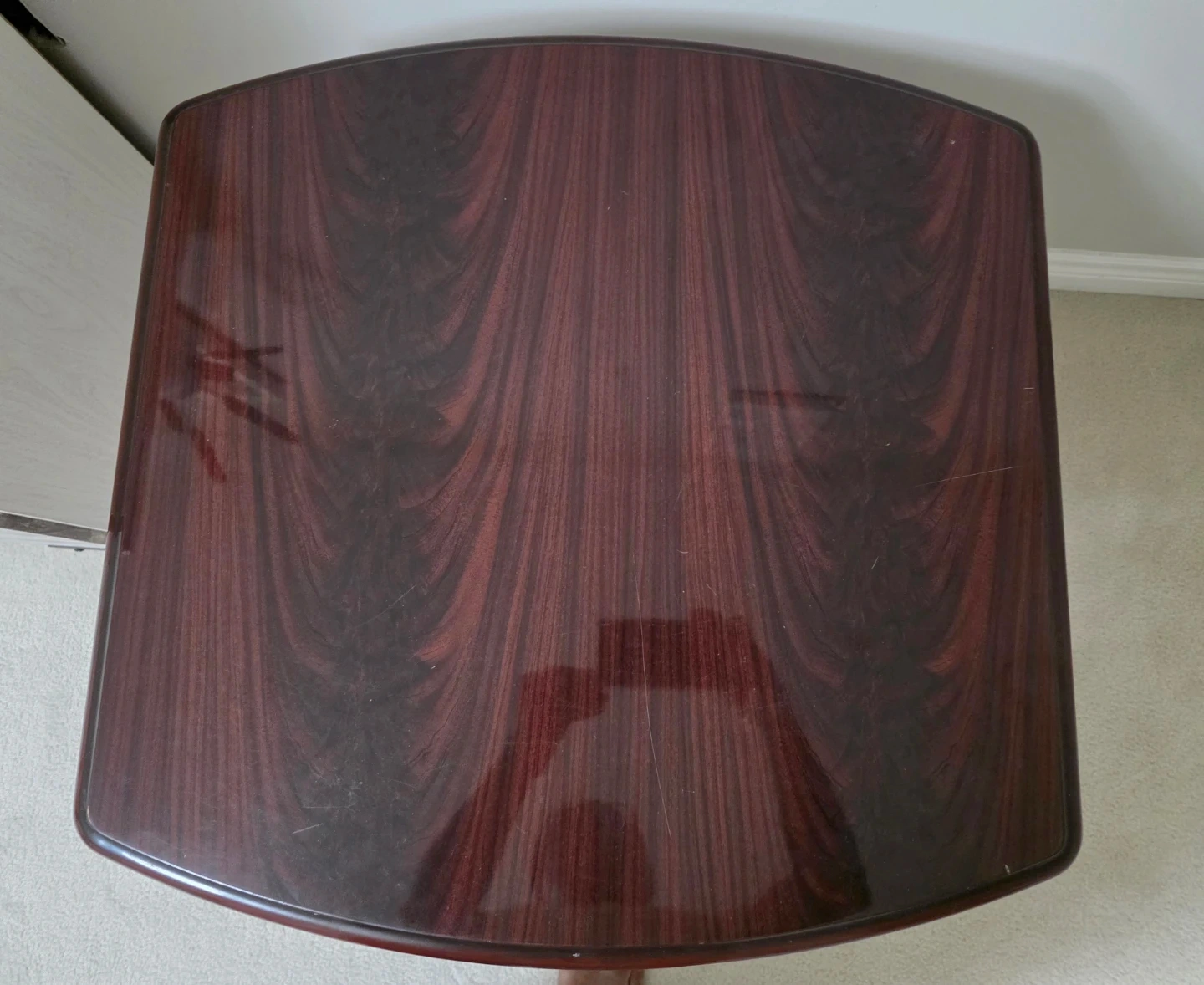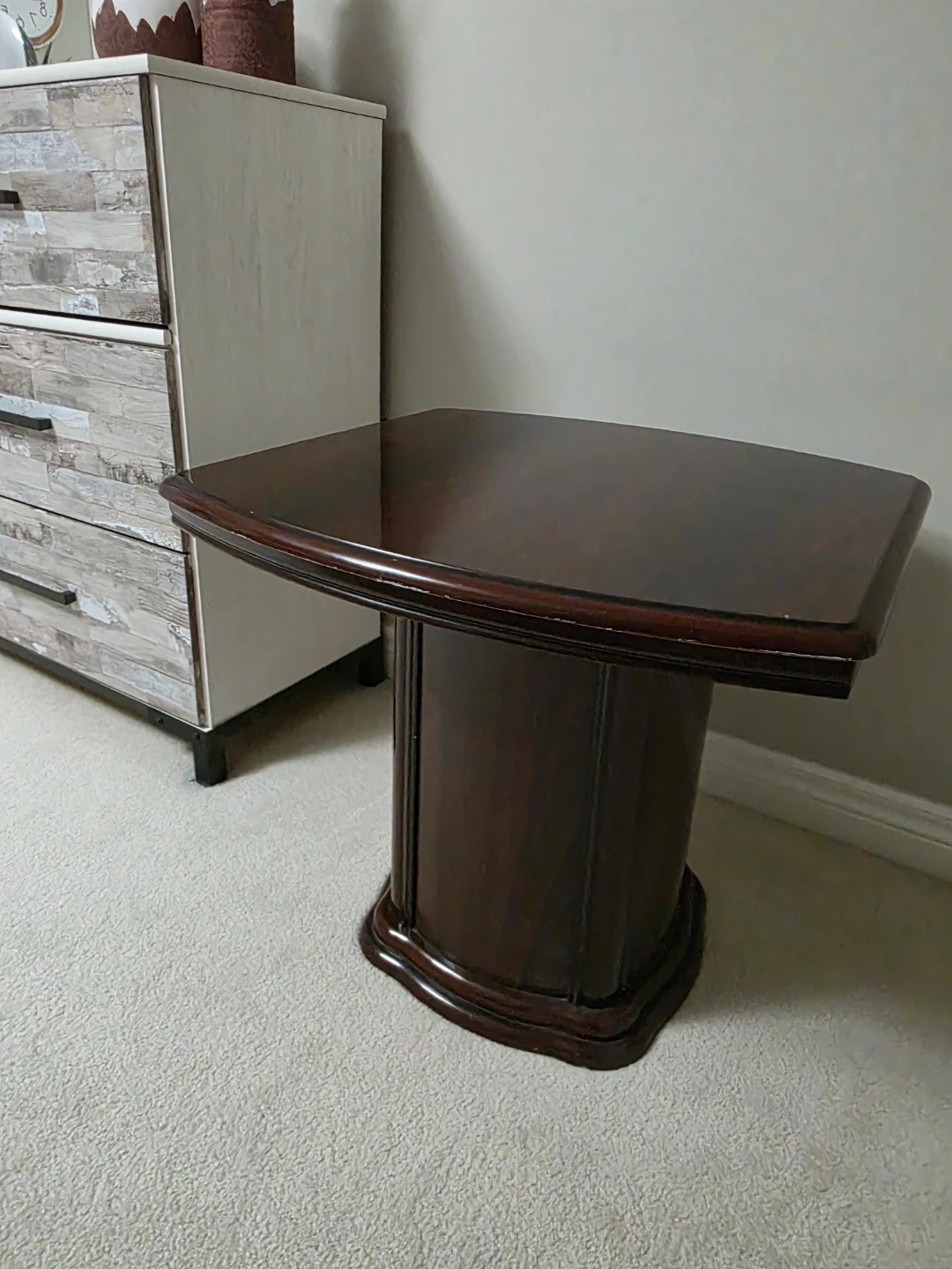A lovely mahogany side table, perfect for adding a touch of elegance to any room! It features a unique pedestal base and a smooth, curved tabletop. The table is in great condition and ready to be a stylish addition to your home