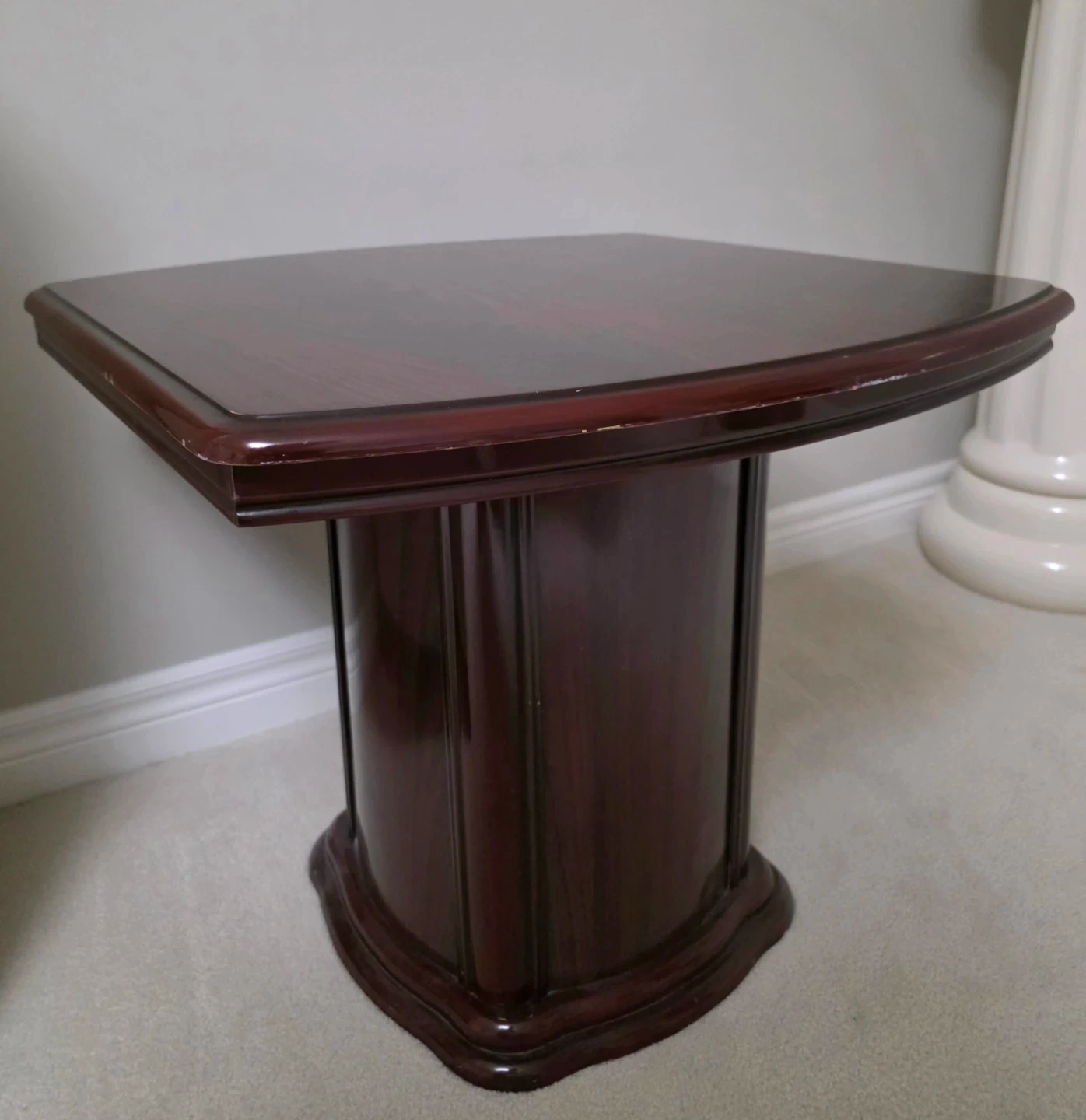 A lovely mahogany side table, perfect for adding a touch of elegance to any room! It features a unique pedestal base and a smooth, curved tabletop. The table is in great condition and ready to be a stylish addition to your home
