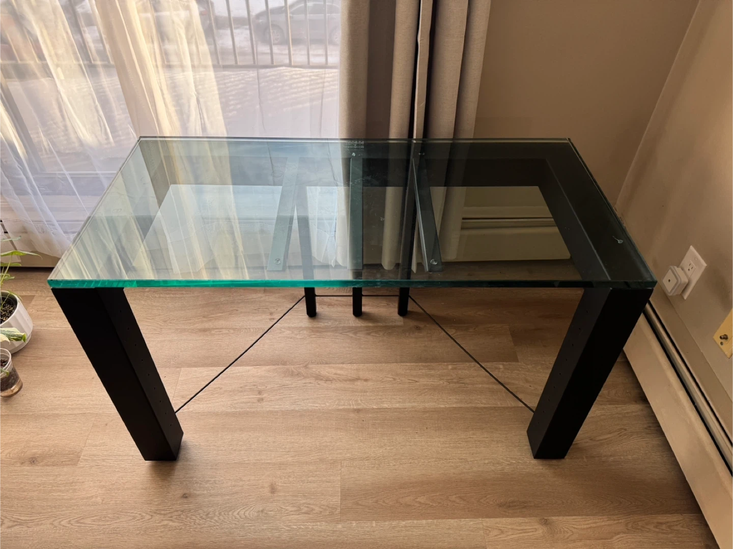 A sleek desk featuring a clear glass top and a sturdy black metal frame. It's a stylish piece for any home office or workspace. The minimalist design makes it a versatile addition to your decor.