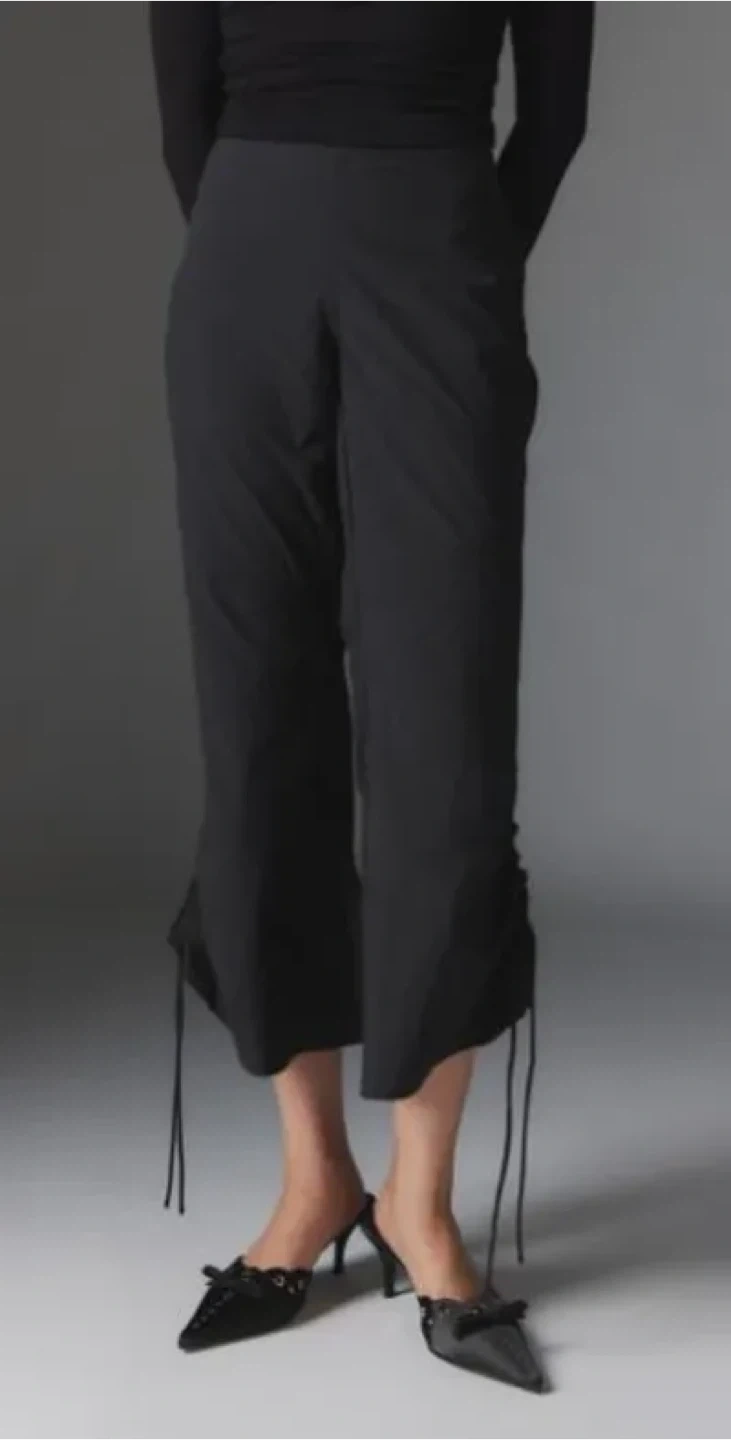 These black cropped pants feature a unique ruched design along the sides with drawstring detailing. They're made from a lightweight material, perfect for warmer weather.