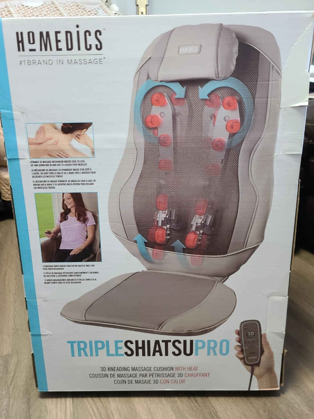 Selling a HoMedics Triple ShiatsuPro massage cushion with heat. It features 3D kneading and dynamic shiatsu massage for deep tissue relief. This unit includes the original box and remote for easy operation.