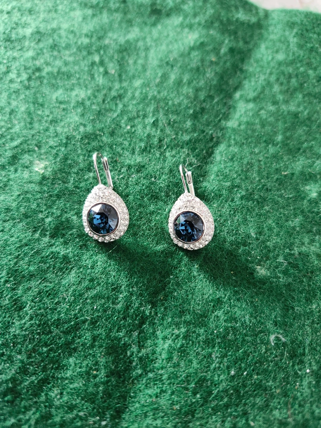 A pair of elegant drop earrings featuring a deep blue central stone surrounded by clear crystals. The setting appears to be silver-toned metal. These earrings would add a touch of sparkle to any outfit.