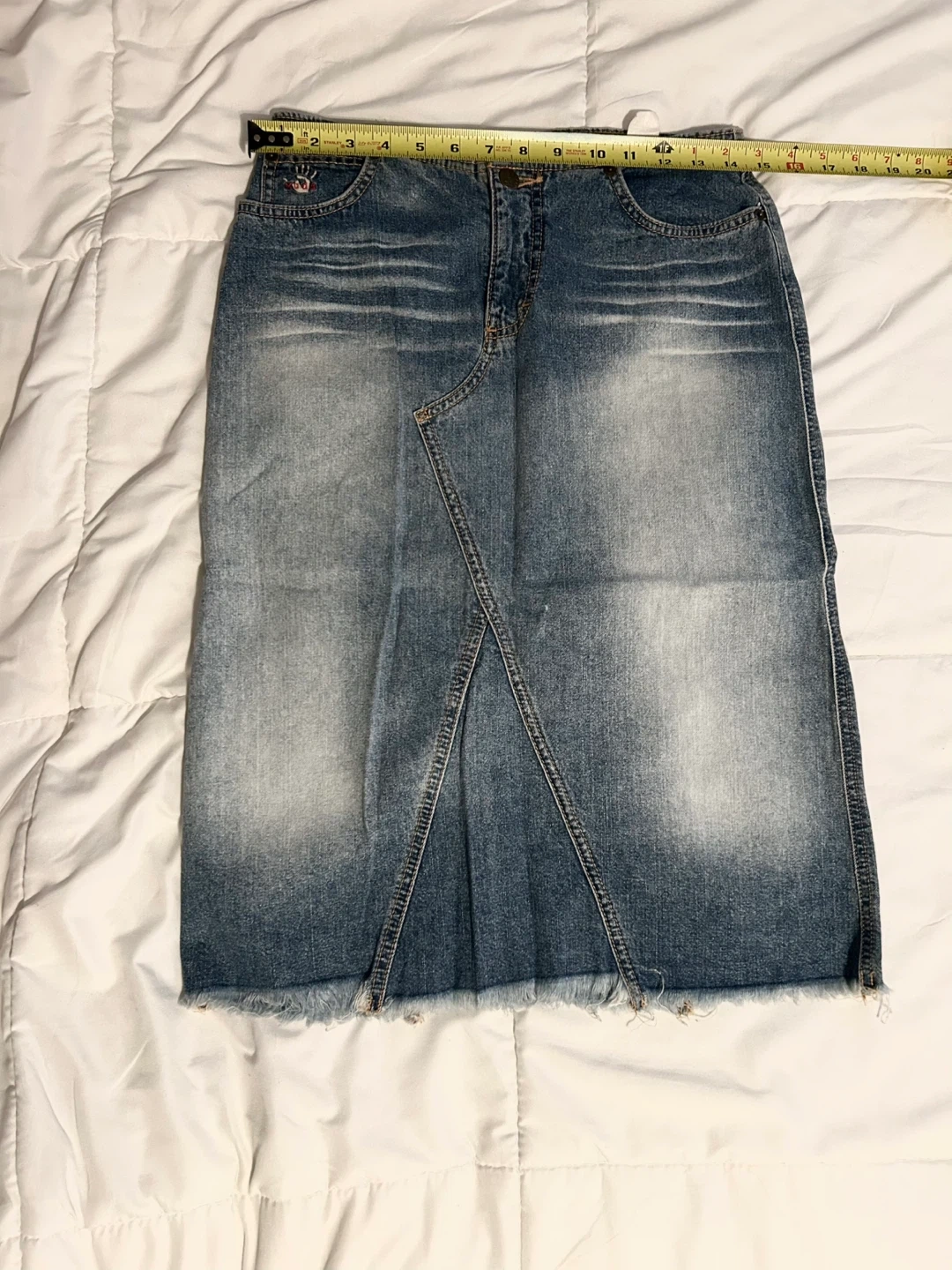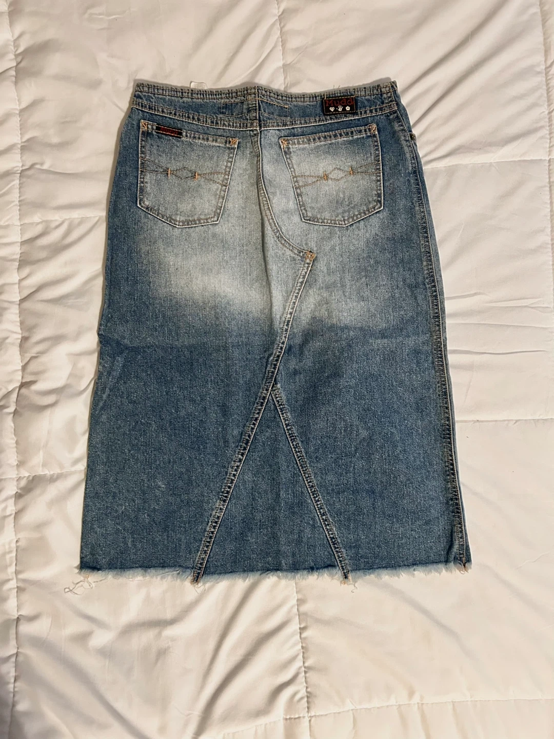 Vintage Y2K Mudd denim midi skirt. Features frayed bottom hem. Vintage size 3. Measurements in photos.