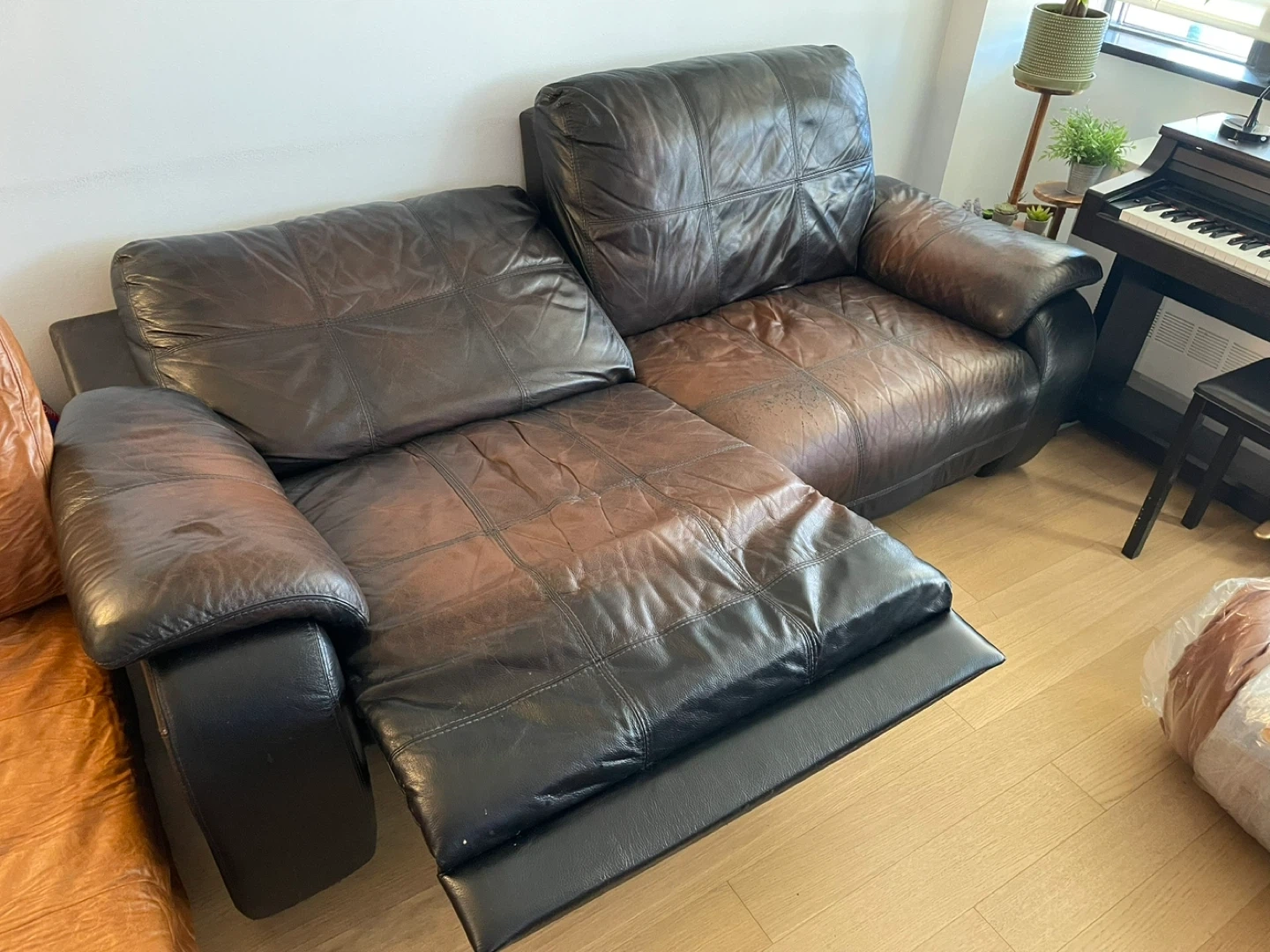 Selling a comfortable two-seat sofa. It's made of brown leather and is perfect for a living room or den. It’s 10 years old with some wear on the seating but is in good condition for sleeping or sitting. It can also extend out a full 180 degrees for sleeping on both sides! $200 OBO.