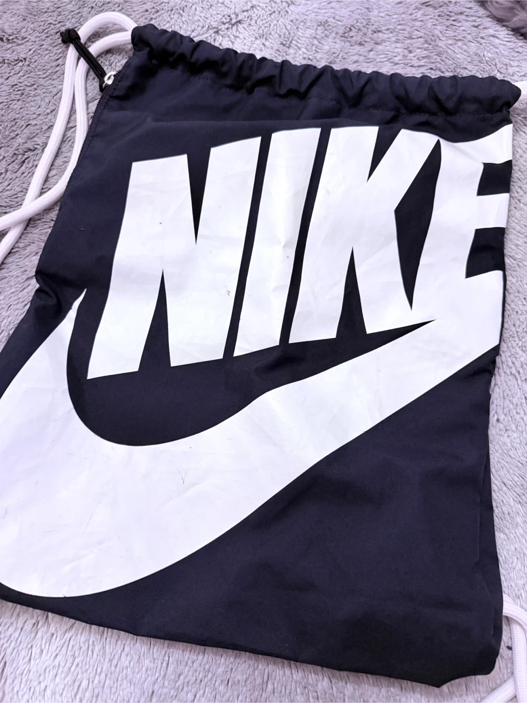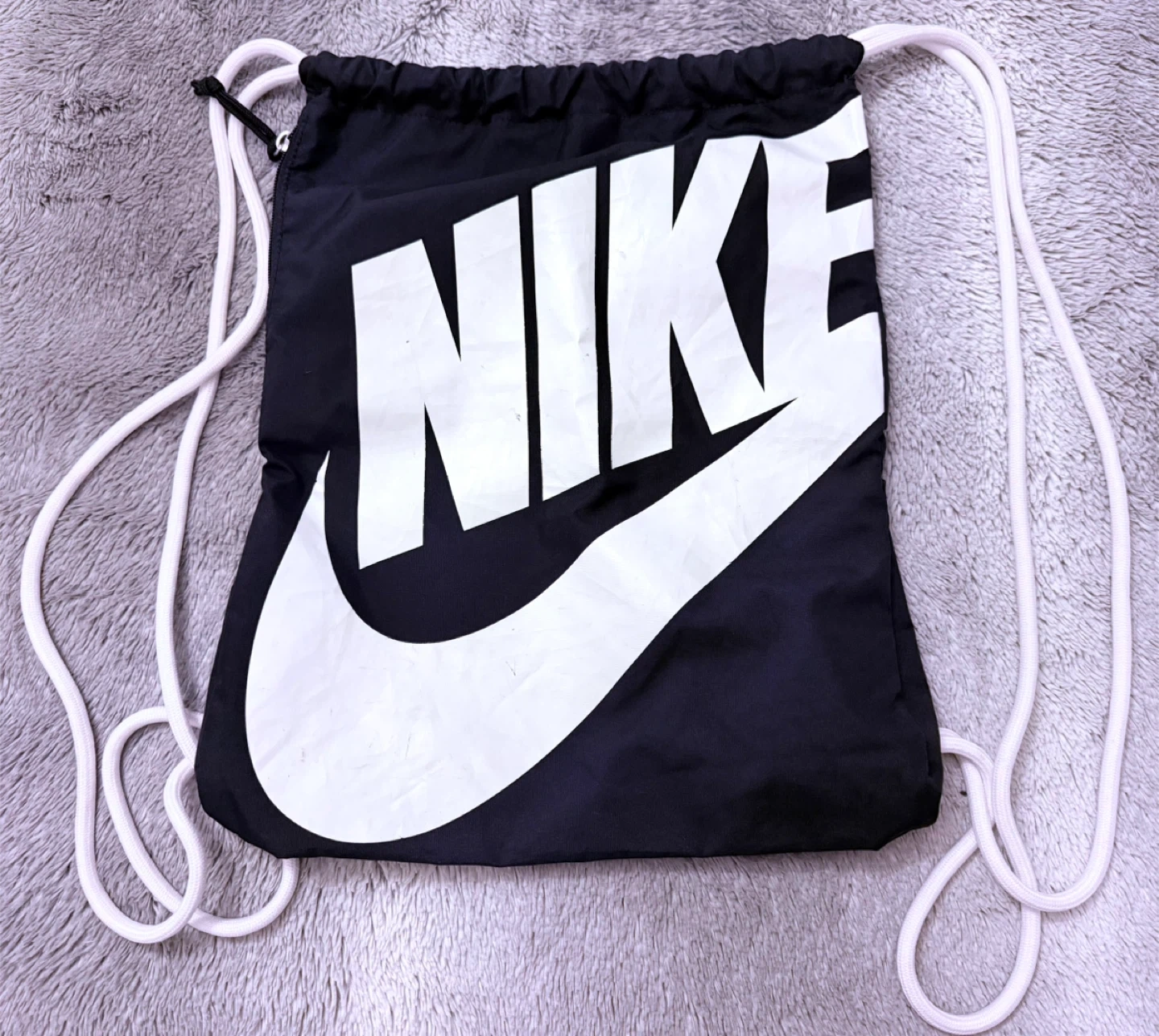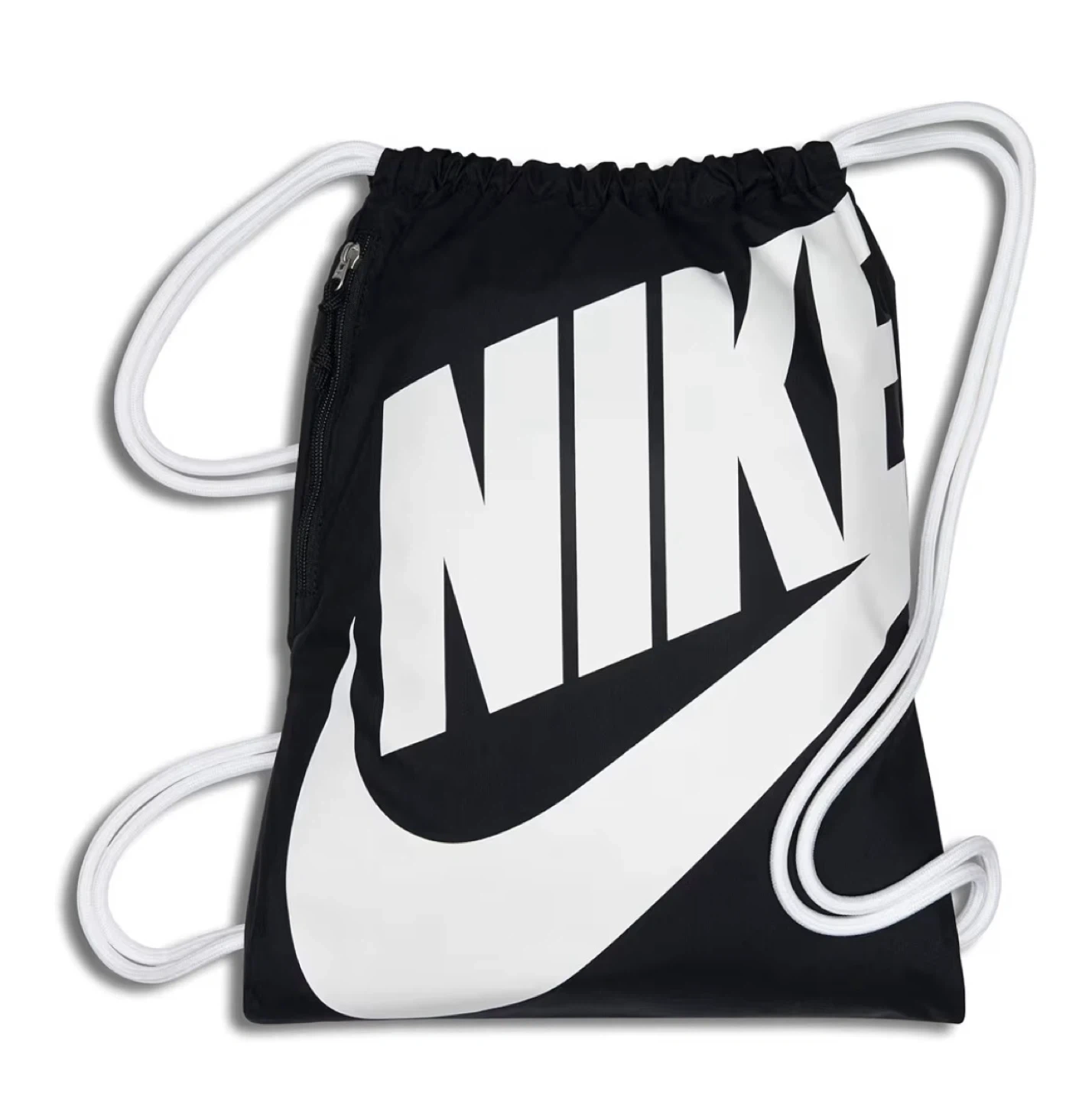 This is a black Nike drawstring bag with a large white Swoosh logo. It's made of durable material and features white drawstrings that double as shoulder straps. It has a zippered pocket on the side for smaller items. Unisex.