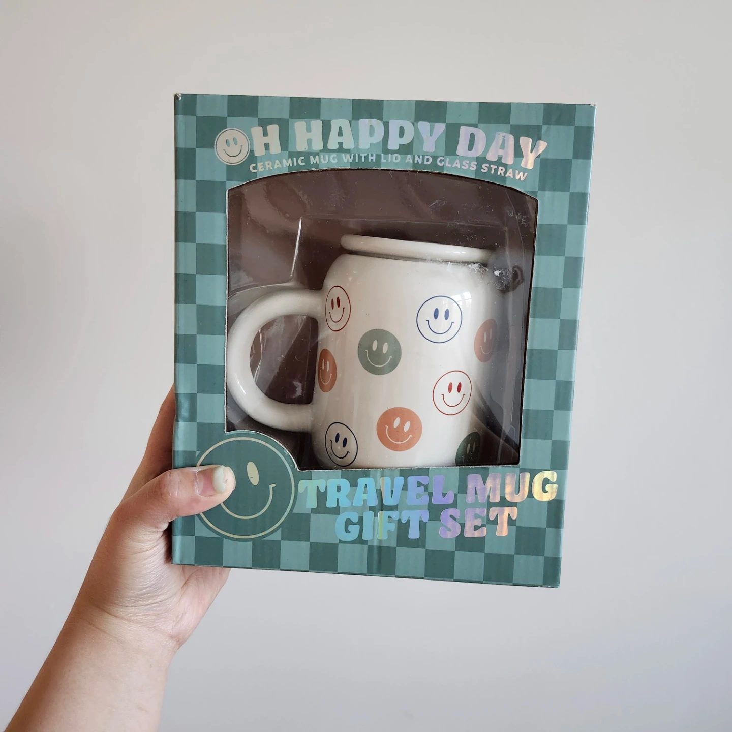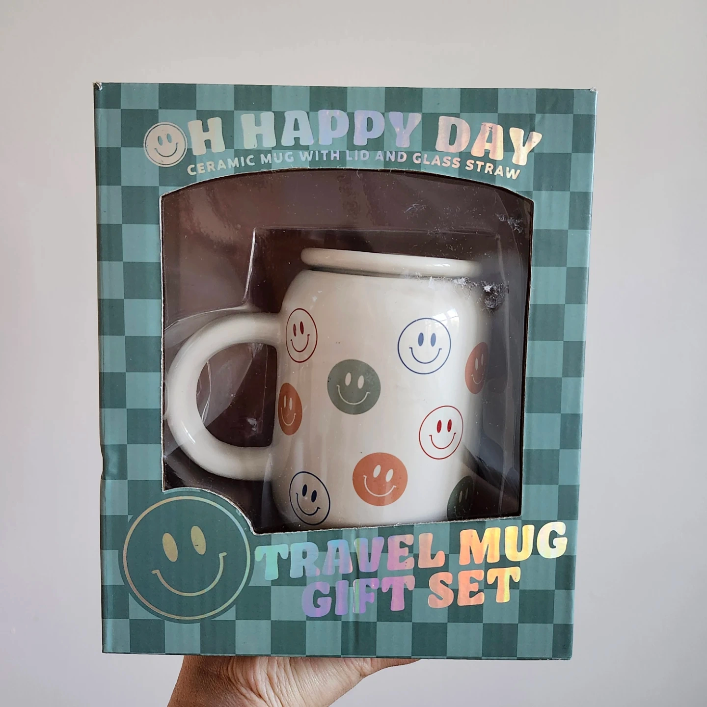 Selling a brand new Oh Happy Day travel mug gift set! It's a ceramic mug that comes with a lid and a glass straw. The box is included!