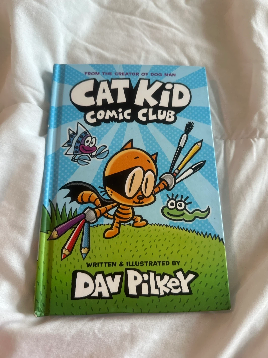 Cat Kid Comic Club book, written and illustrated by Dav Pilkey. It's from the creator of Dog Man. This comic club book encourages creativity and drawing.