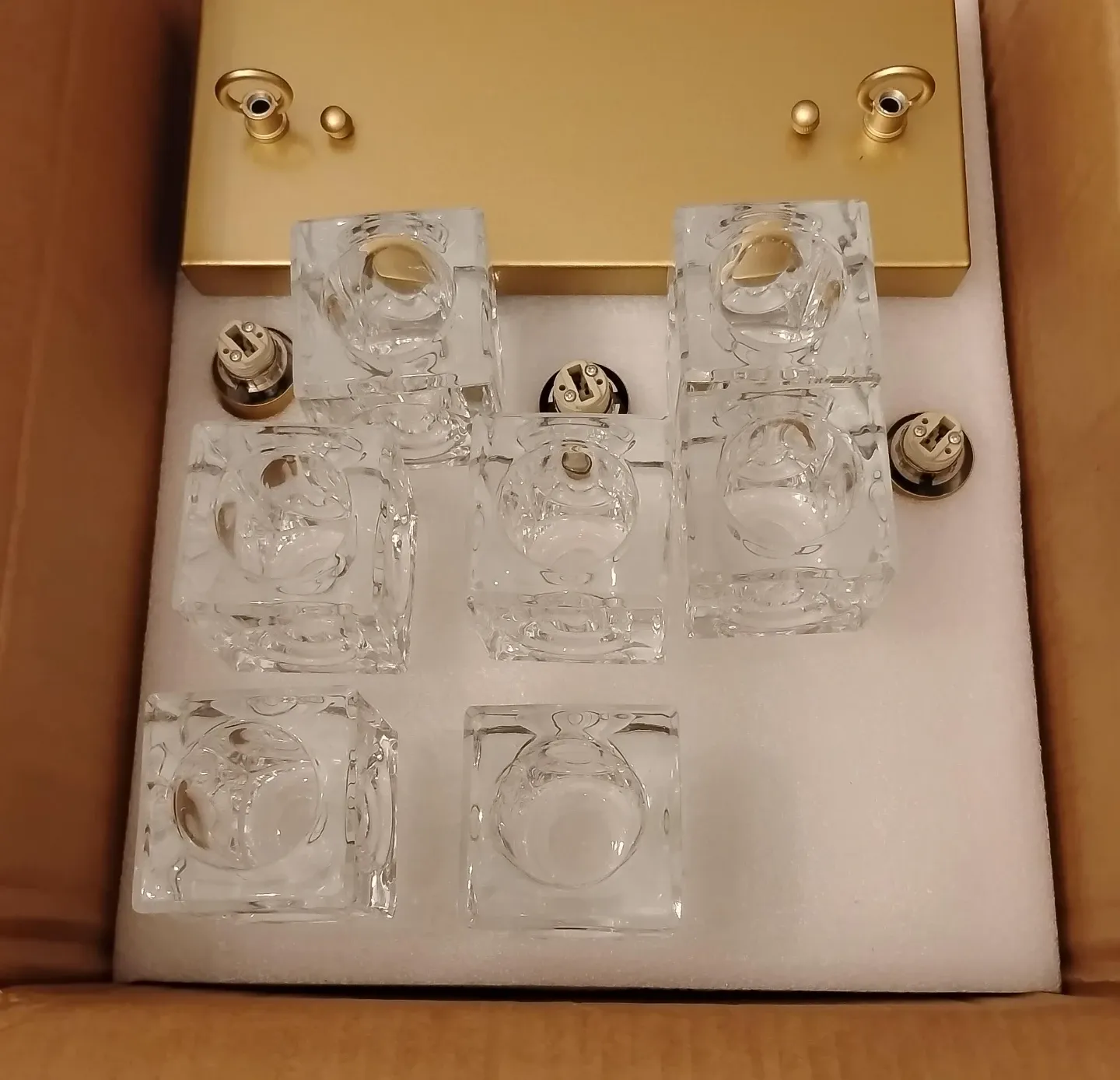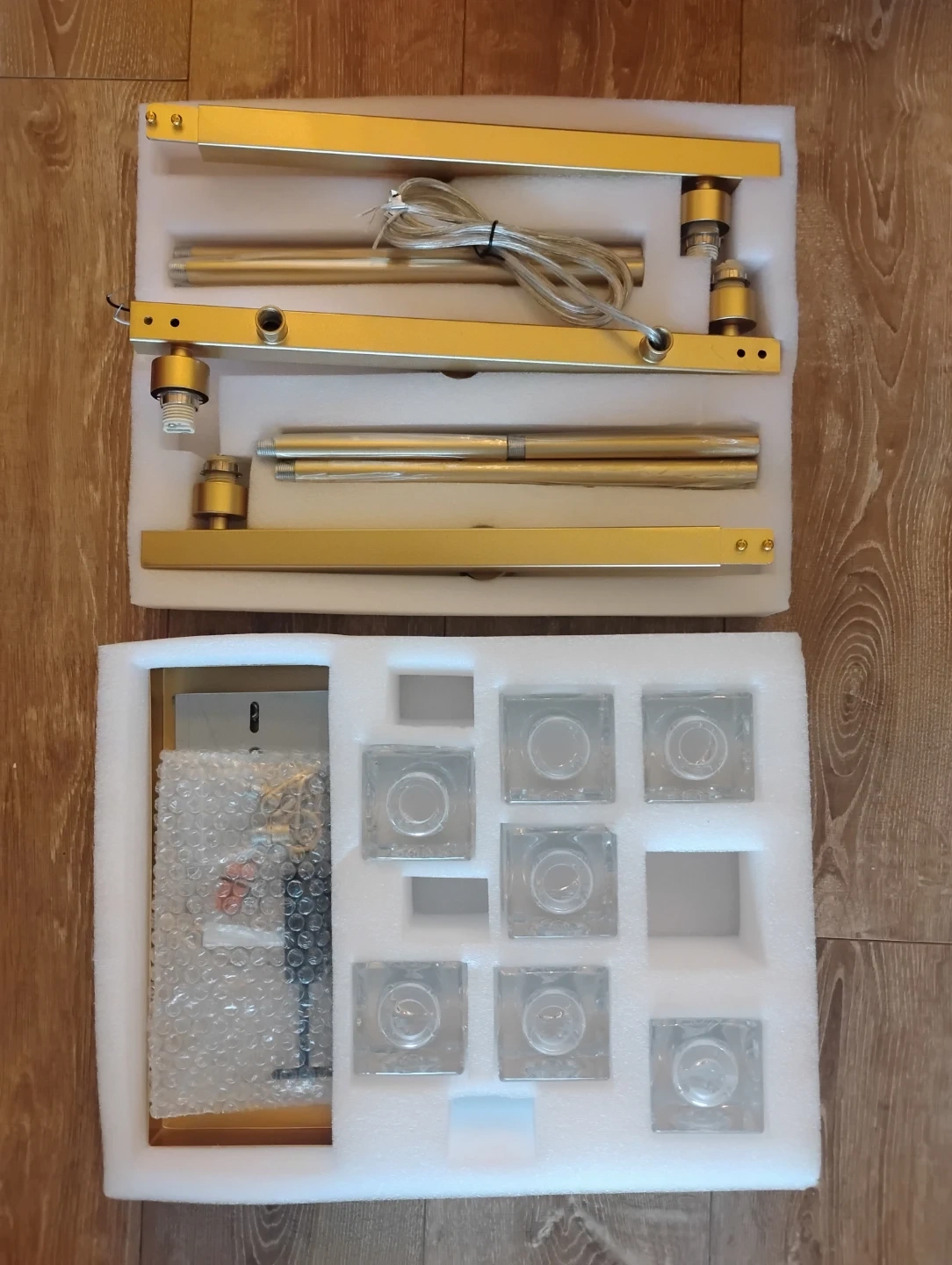 This is a brand new modern chandelier fixture with a brass finish and crystal accents. It includes all necessary components and mounting hardware for installation. A stunning addition to any room, it's perfect for dining areas or entryways.