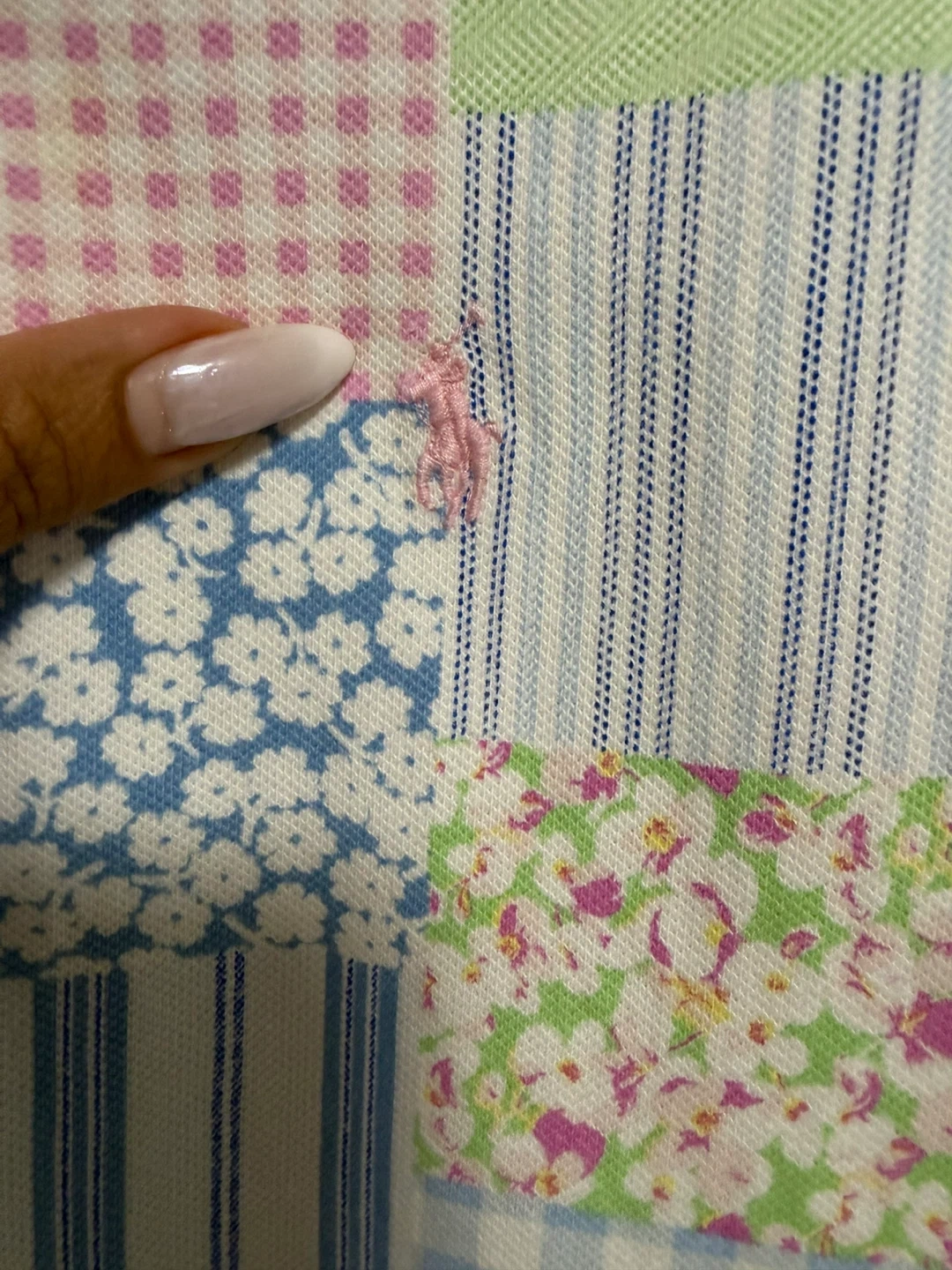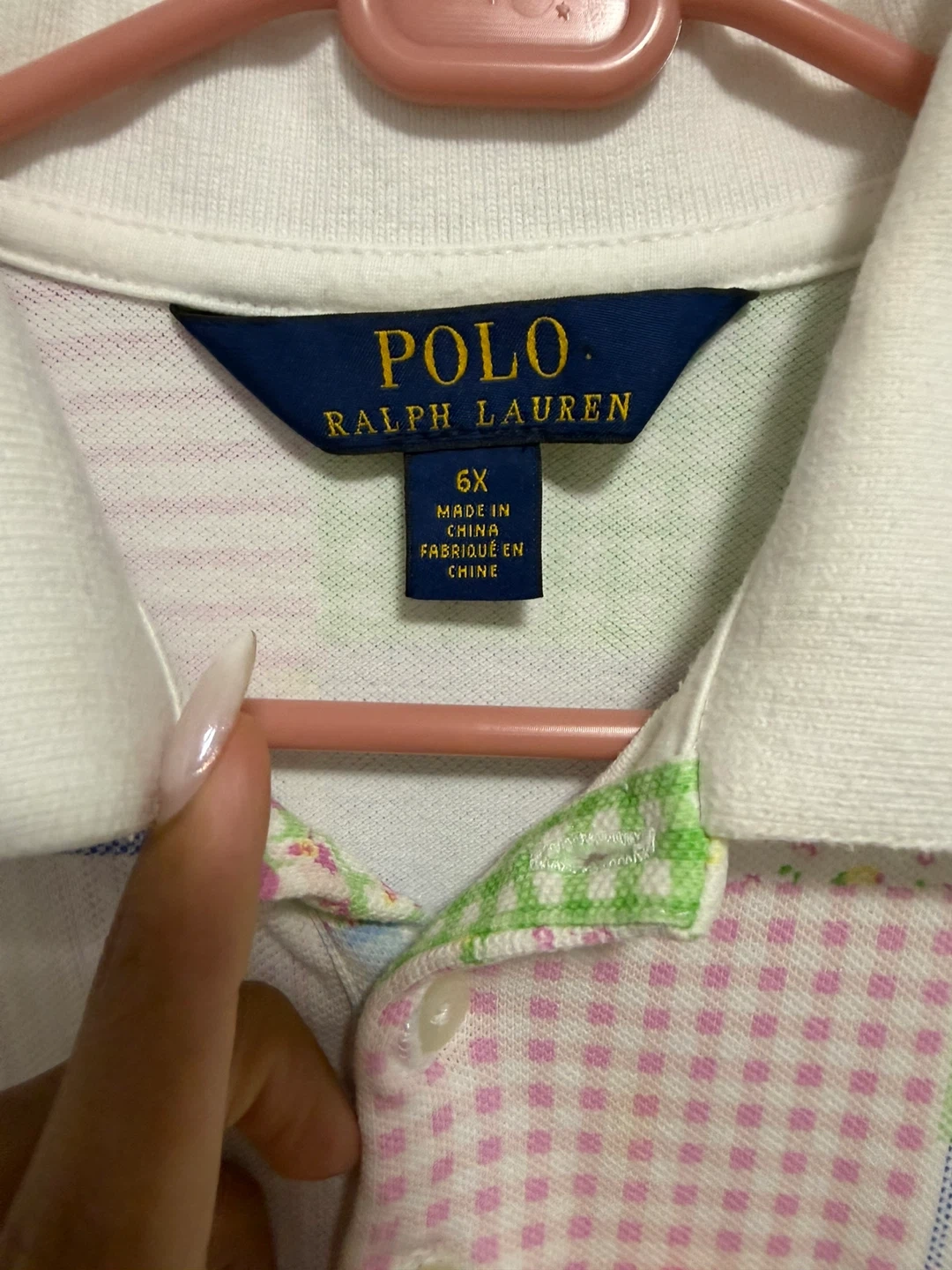 This is a Polo Ralph Lauren dress. It's a size 6X with a colourful patchwork design. Features a collared neckline and a ruffled hem.
