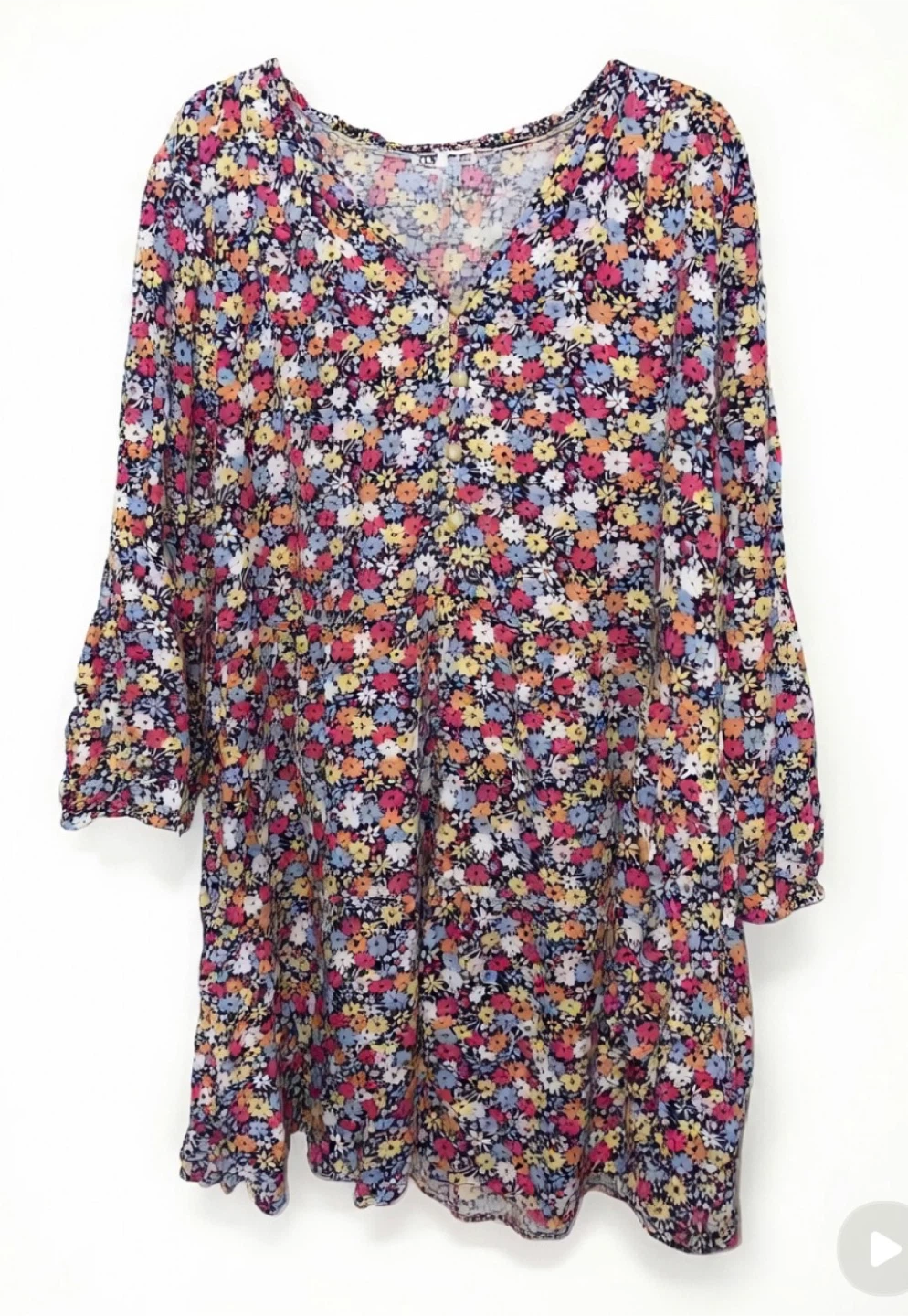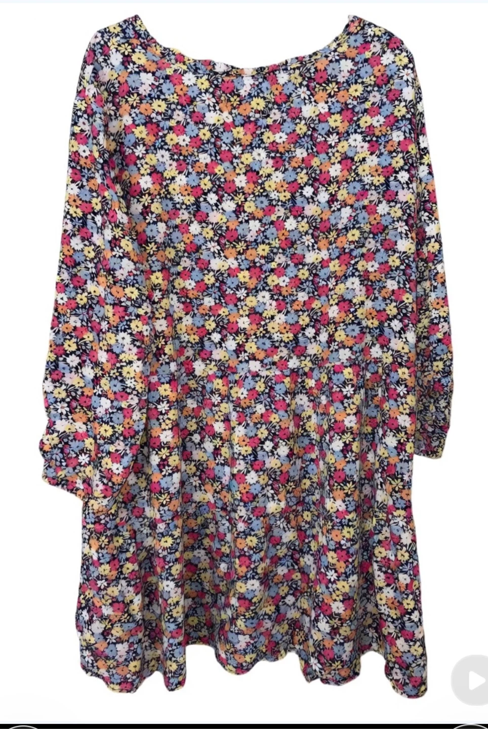This dress features a colorful floral print throughout. It has long sleeves and a comfortable fit. Made from a lightweight fabric.