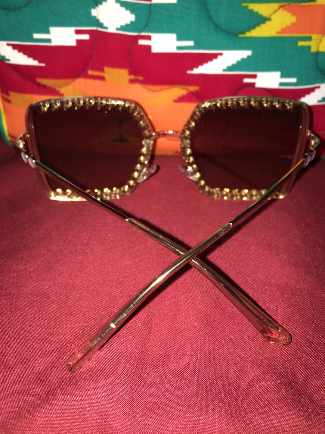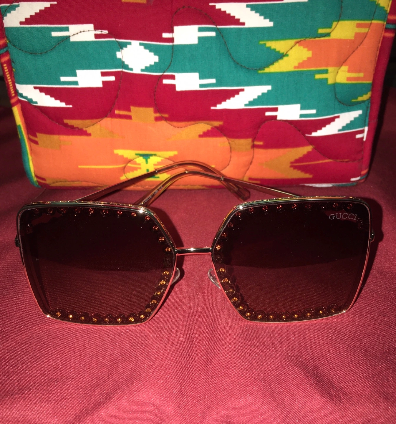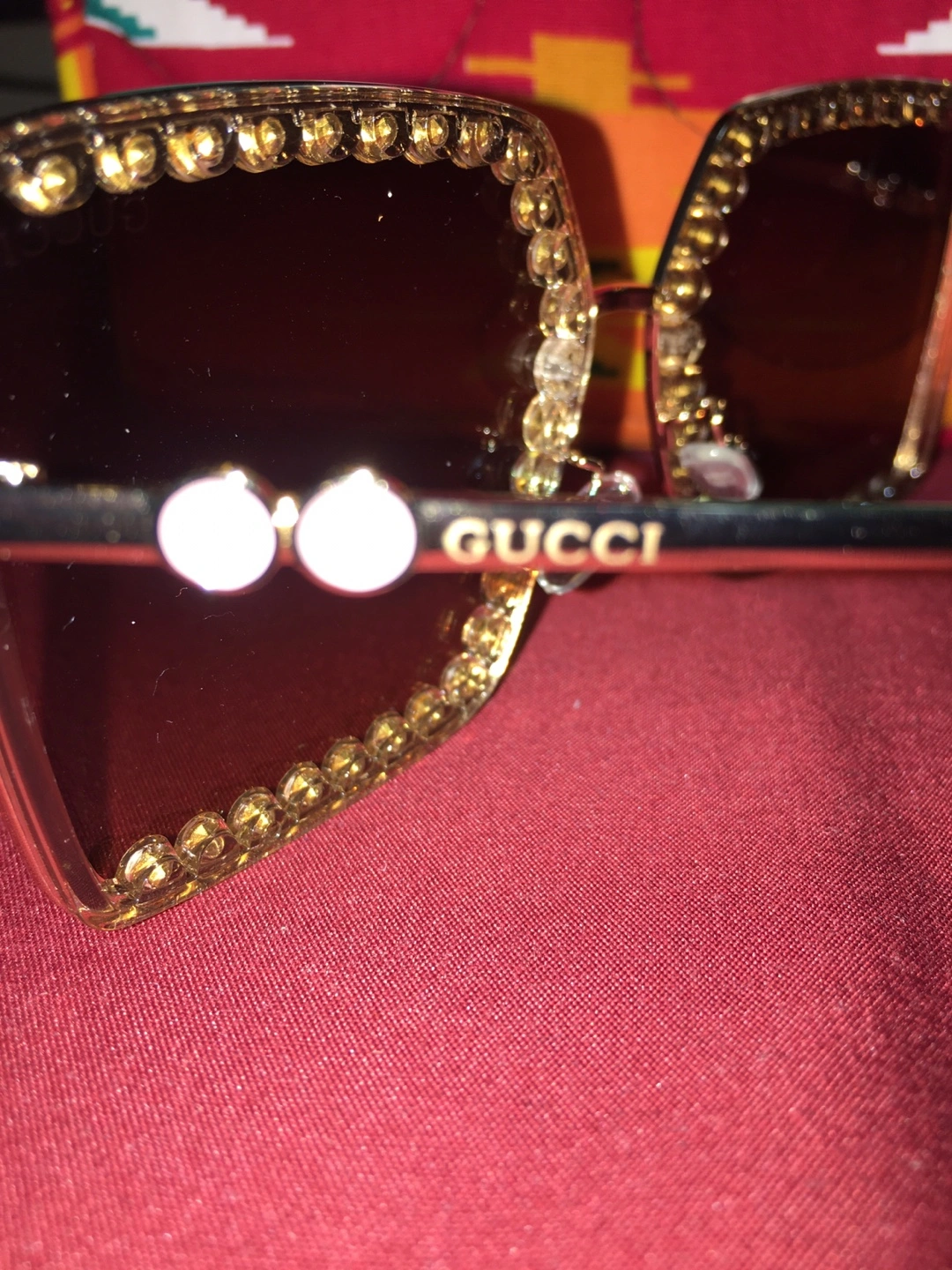 These Gucci sunglasses feature a bold, oversized square frame embellished with sparkling crystals. The gradient brown lenses offer stylish sun protection.