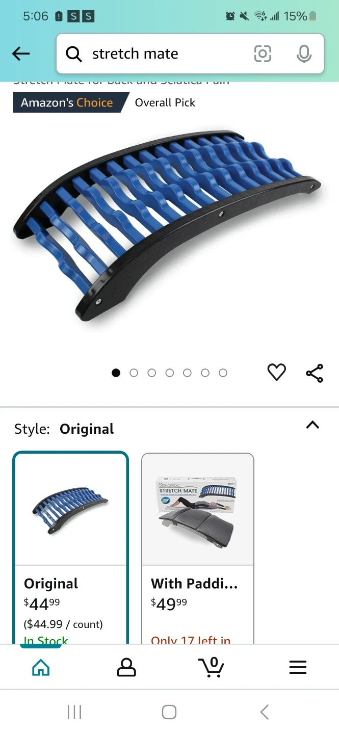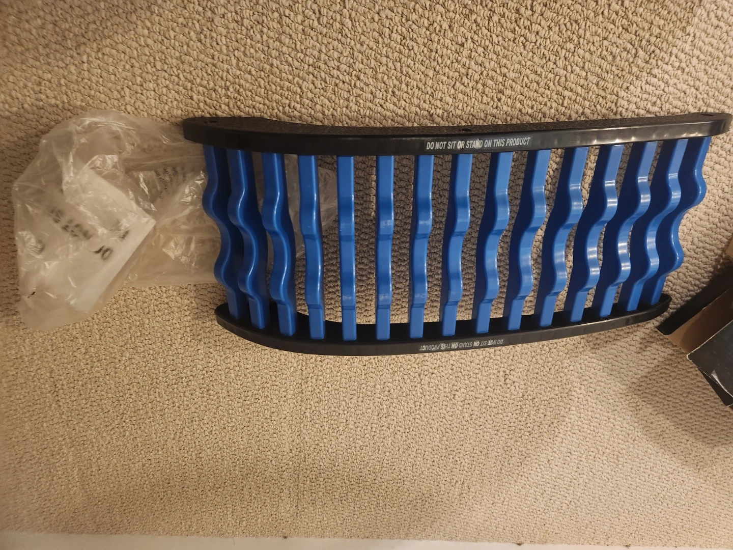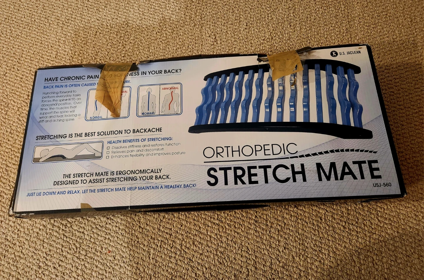 This is the Orthopedic Stretch Mate, designed to assist with stretching your back. It realigns and supports the vertebrae, helping to ease muscular fatigue and improve flexibility. It's made of durable blue plastic with a black frame.