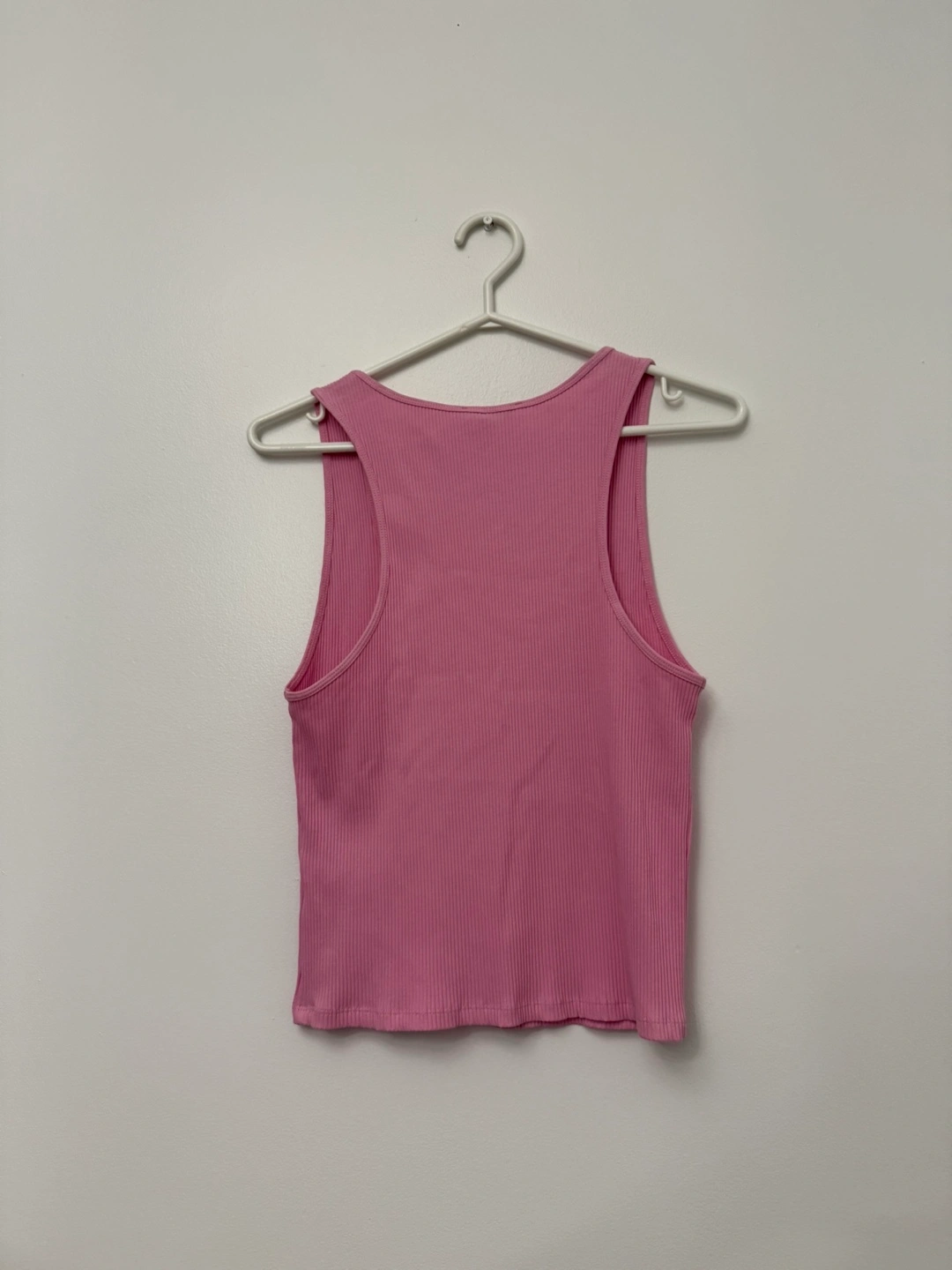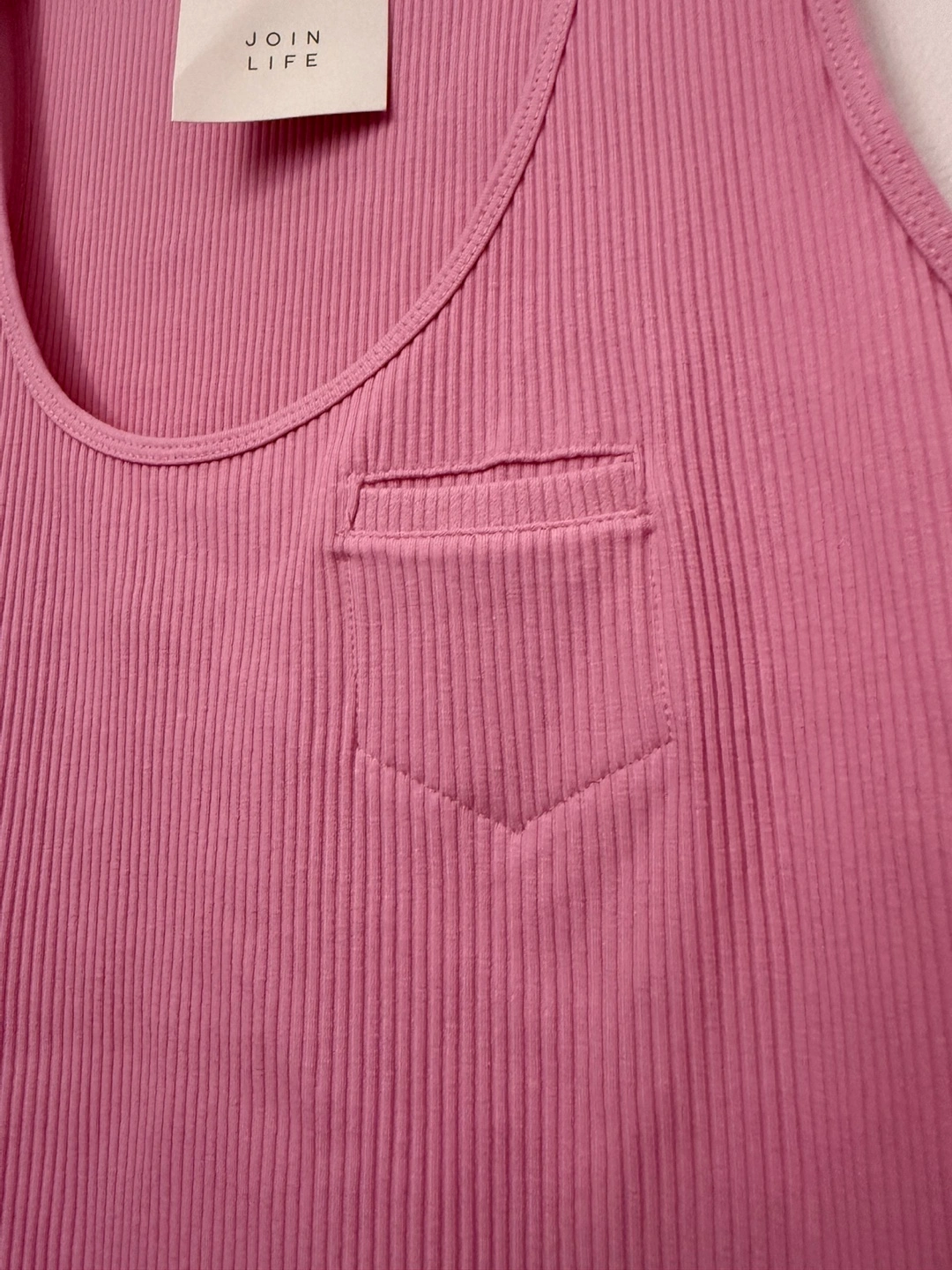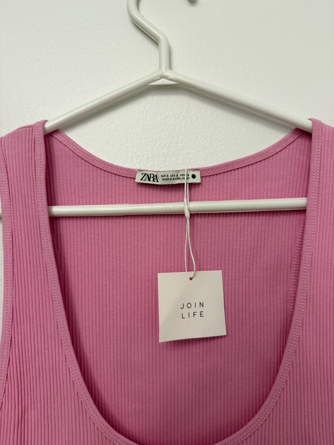 Selling a cute Zara pink ribbed tank top in size S. It's in great condition and features a small pocket detail. New with tags!